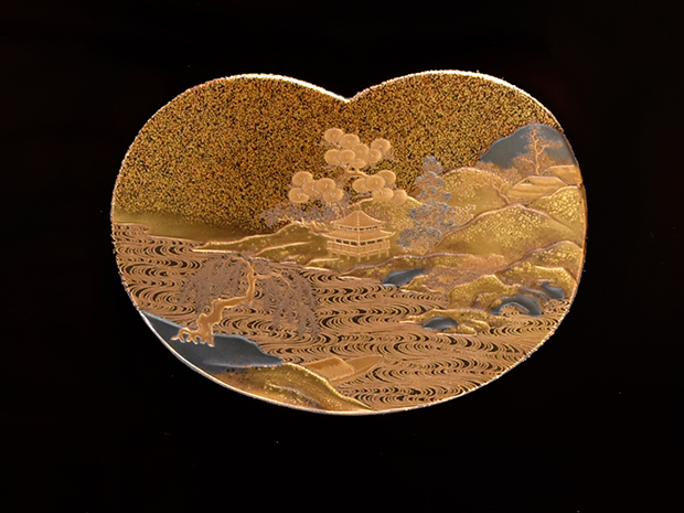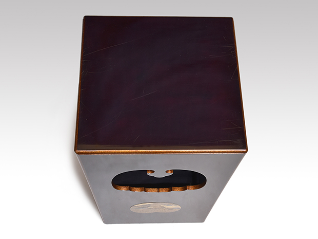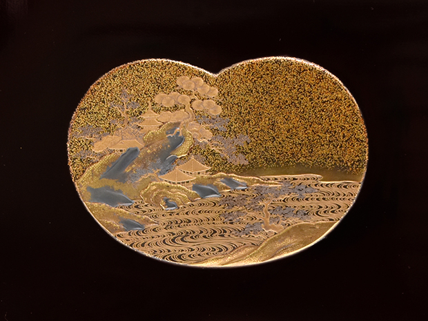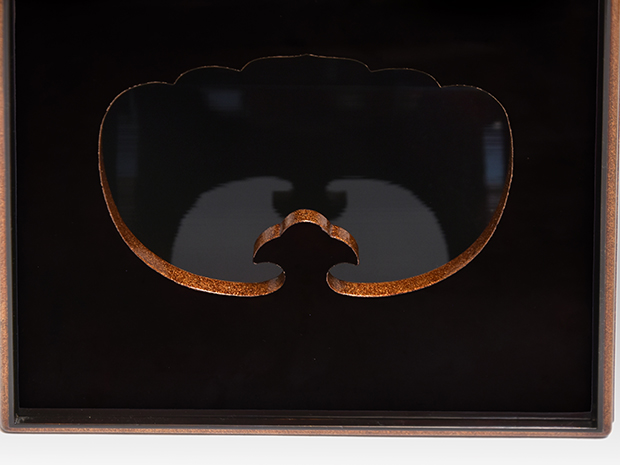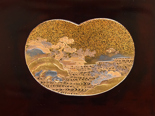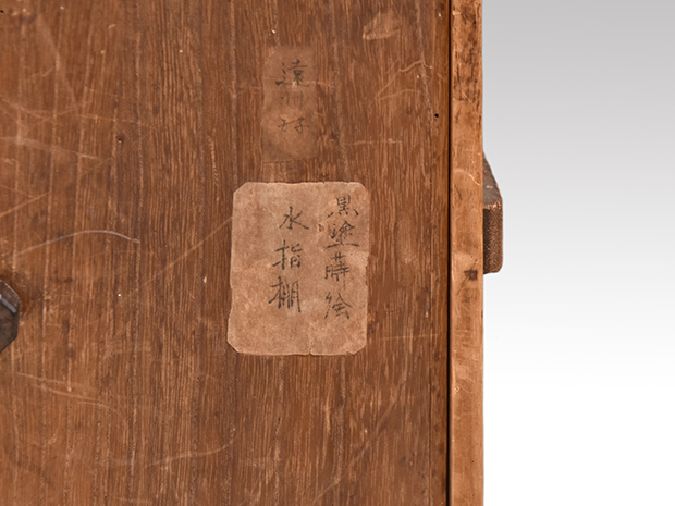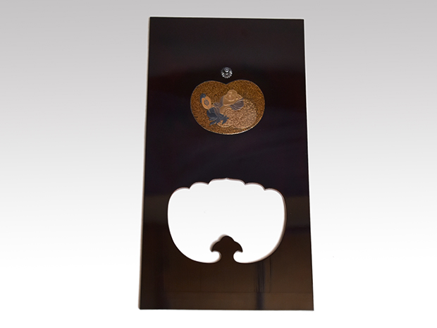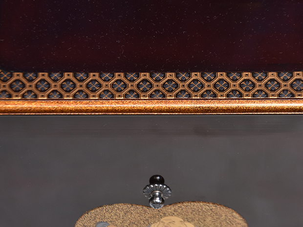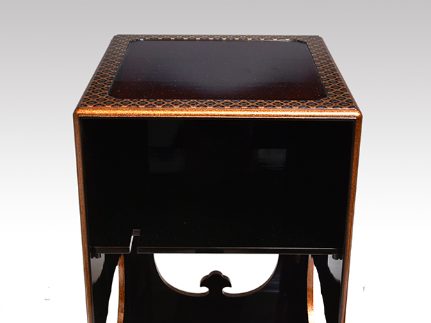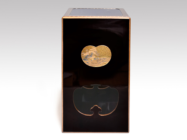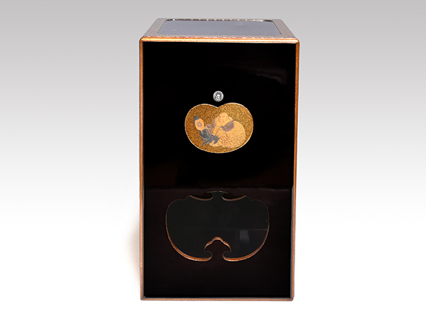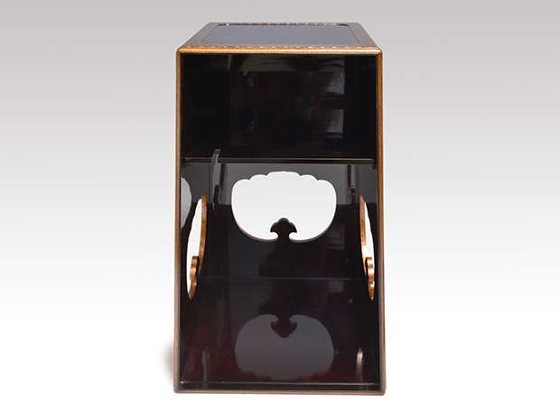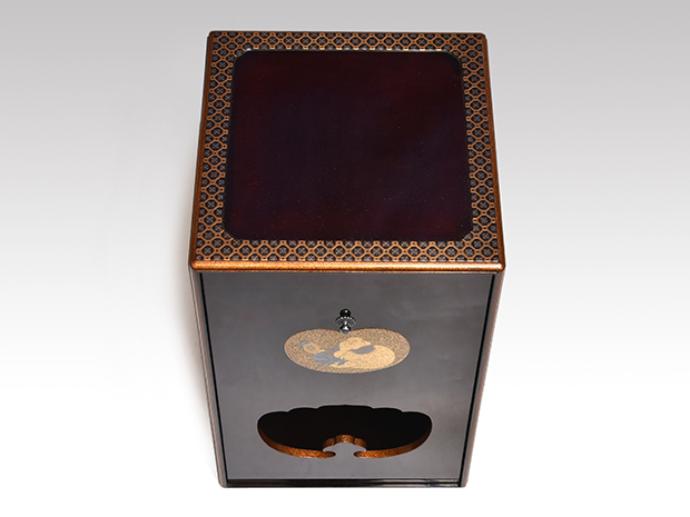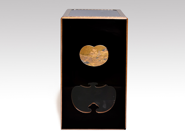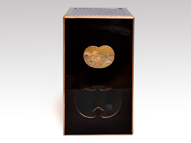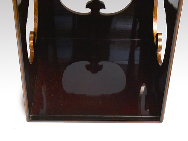 商品説明 | 四方形に真塗を施し、各面下部に火頭窓を開け縁は梨地が施され各面に山水蒔絵が梨地の上に金地銀地で描かれております。 縁は几帳面で細かな梨地で装飾されております。 四方の蒔絵は「正面が布袋で他の三カ所が山水蒔絵」です。 上部の縁一周は格子繋ぎが廻り二色の金色で花文が蒔絵されております。 前の扉を外してから使用します。摘みは銀の菊形です。 100年以上経ておりますがとても良い状態です。 |