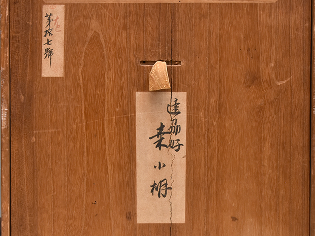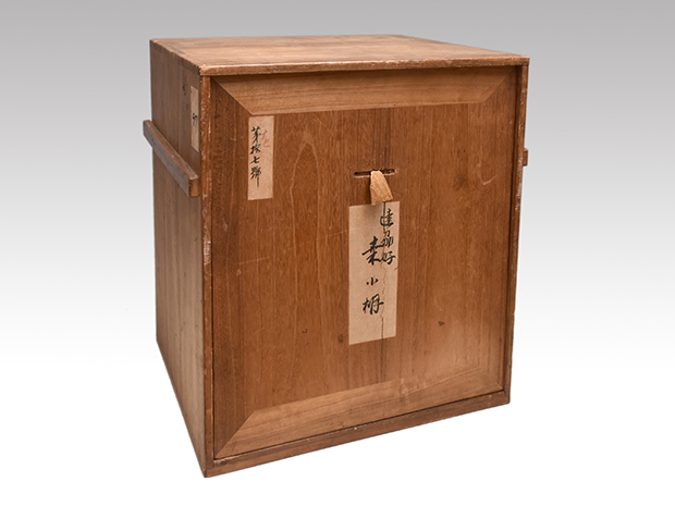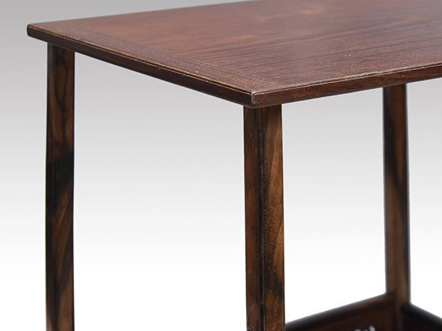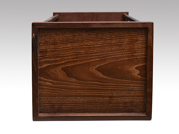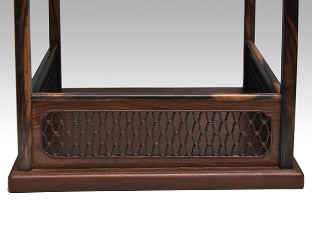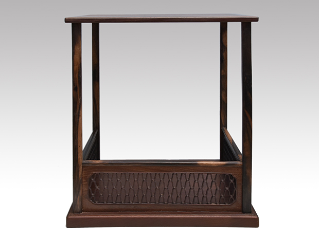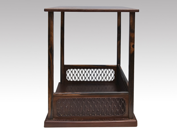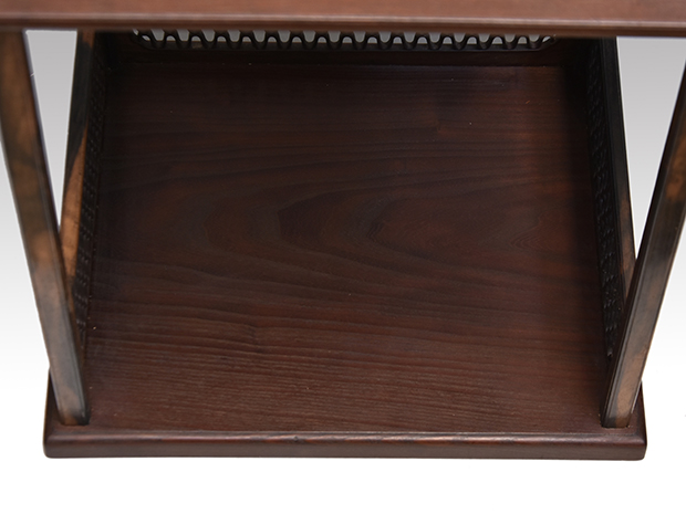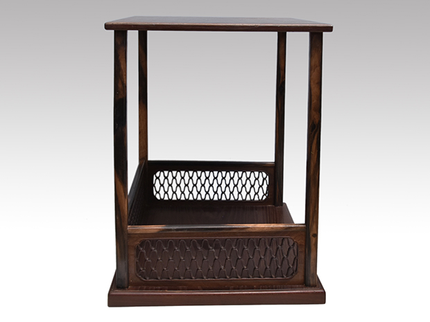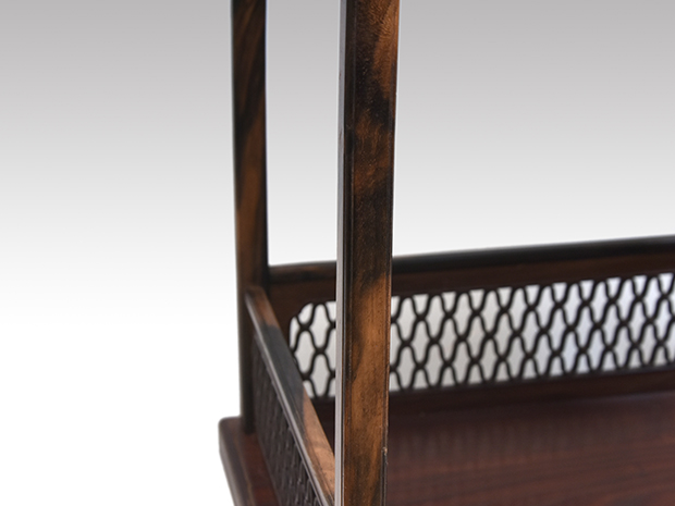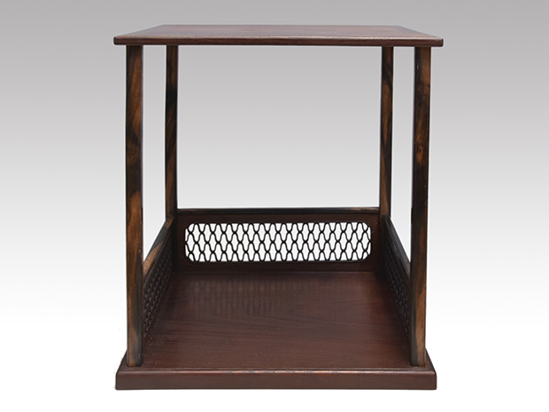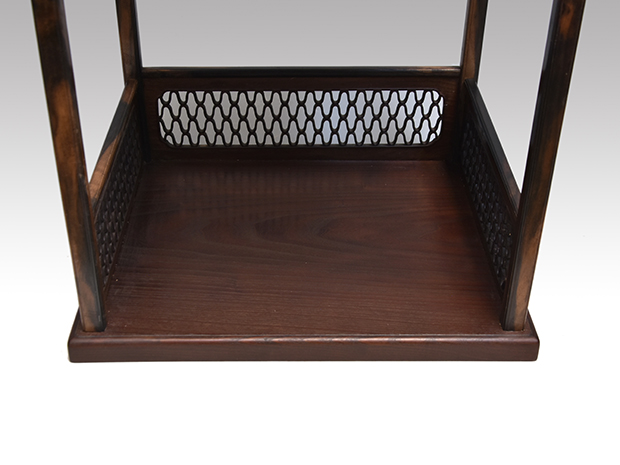 遠州好み寄木の水指棚です。 柱は黒柿で他は桑で製作されております。 角はすべて几帳面で仕上げられております。 透かしも柔らかな仕上げです。 概ね良い状態です。