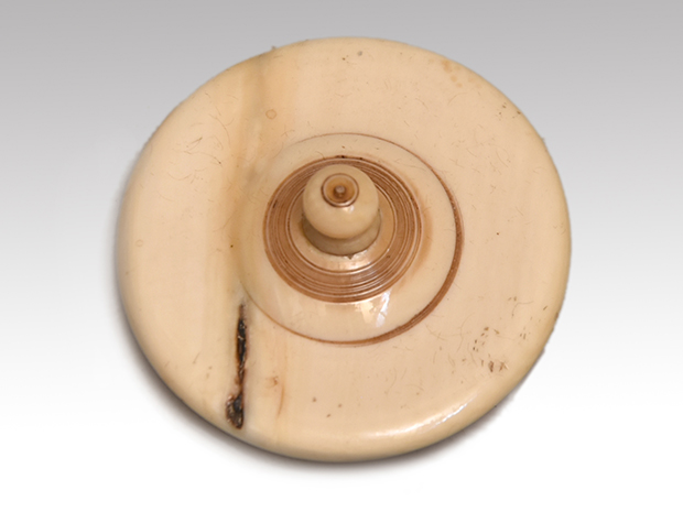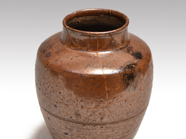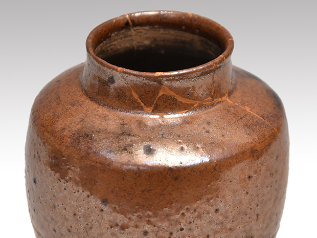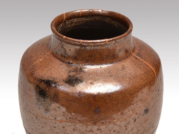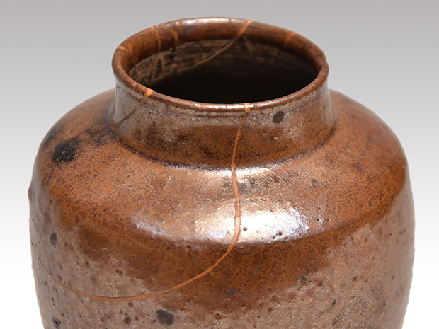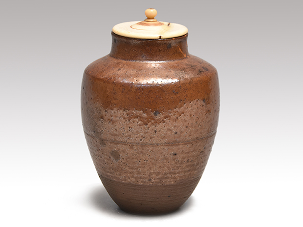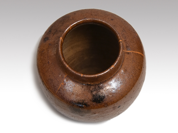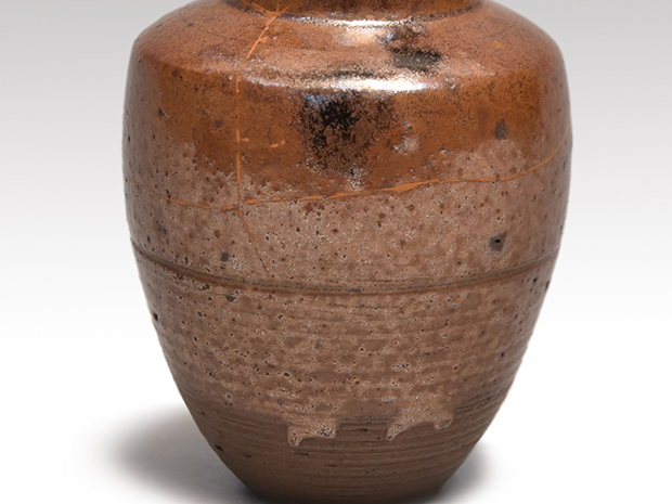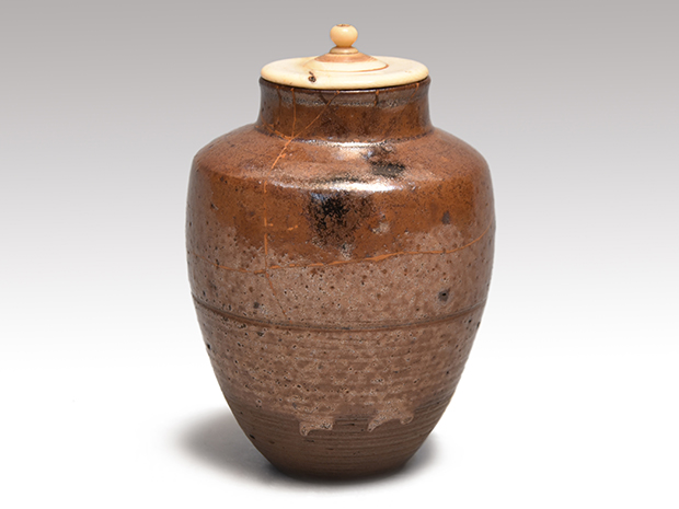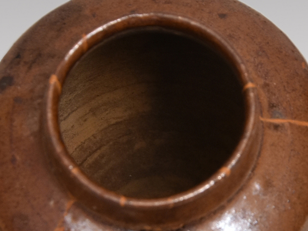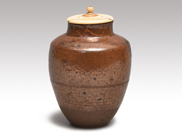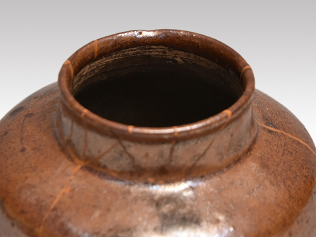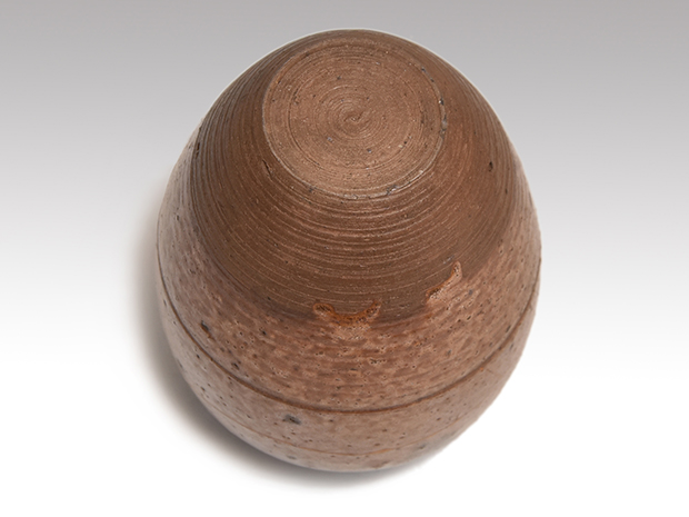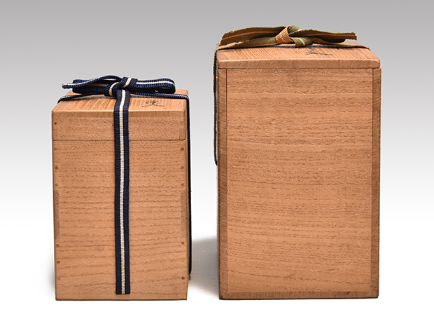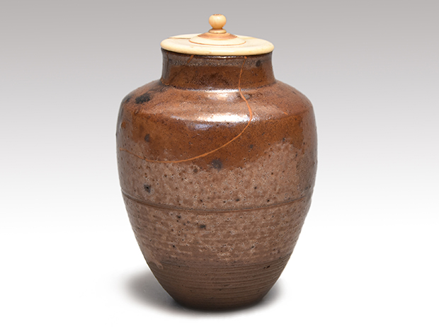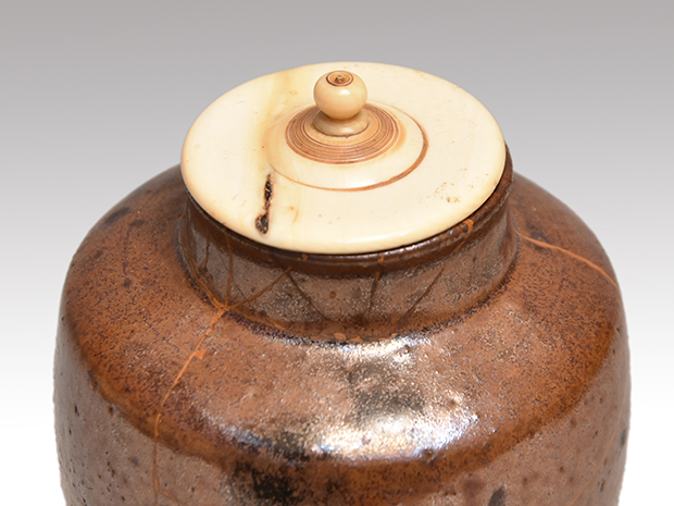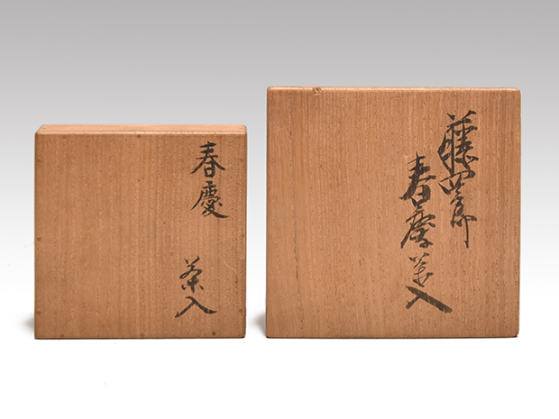 商品説明 | 薮内家七代竹翁が藤四郎春慶茶入と箱書きした茶入れです。 銘「緒手巻」はおだまきの事です。 全体に薄作で軽くなだらかな肩が付き口の立ち上がりが高く、正面にかかった釉薬が控えめです。 腰に胴紐を廻らせ底より胴紐まで轆轤目を見せております。 底は輪糸切です。 口から胴にかけて江戸時代に修復した大きな跡が確認できます。 象牙蓋は時代の巣入りです。 それぞれの箱の底に印が捺されております。 |