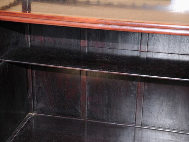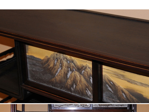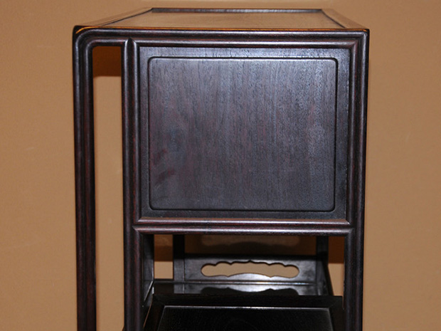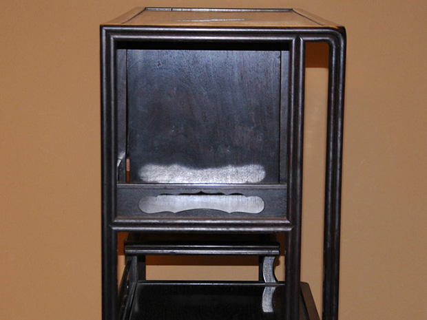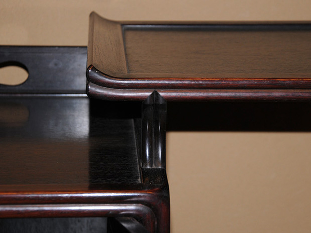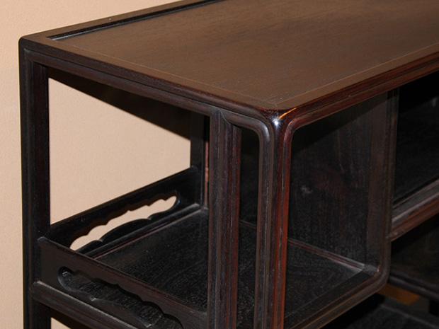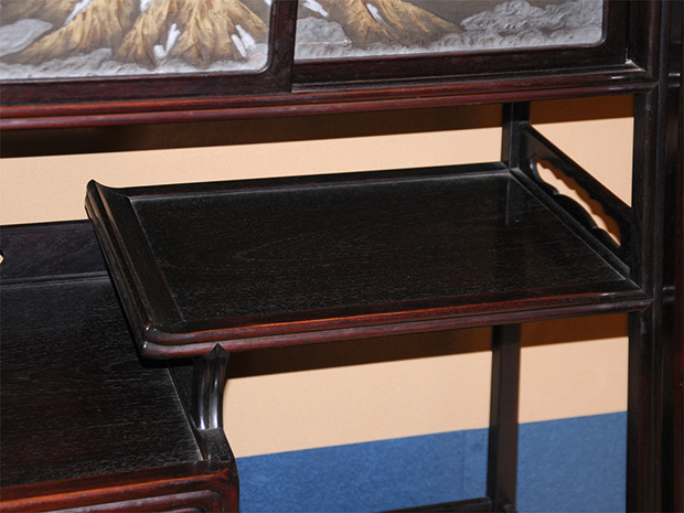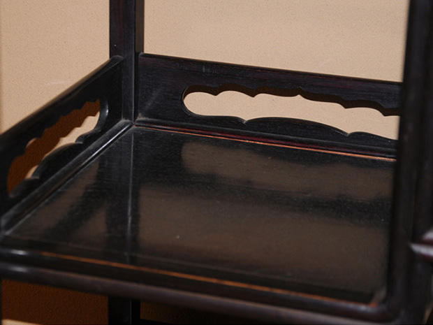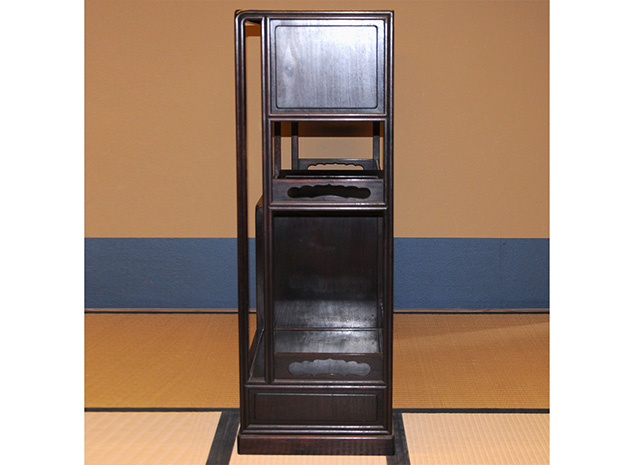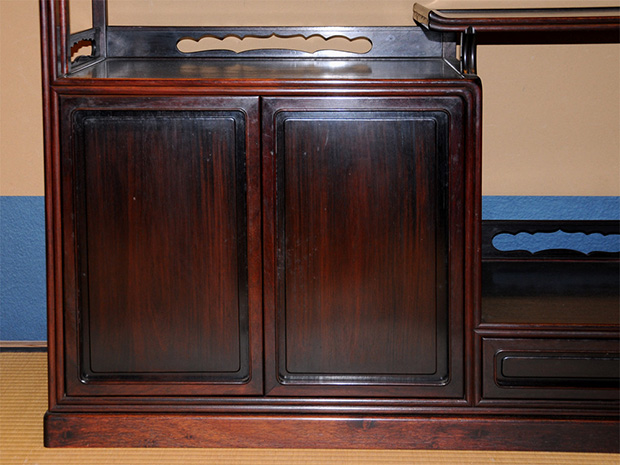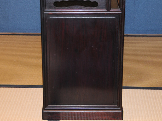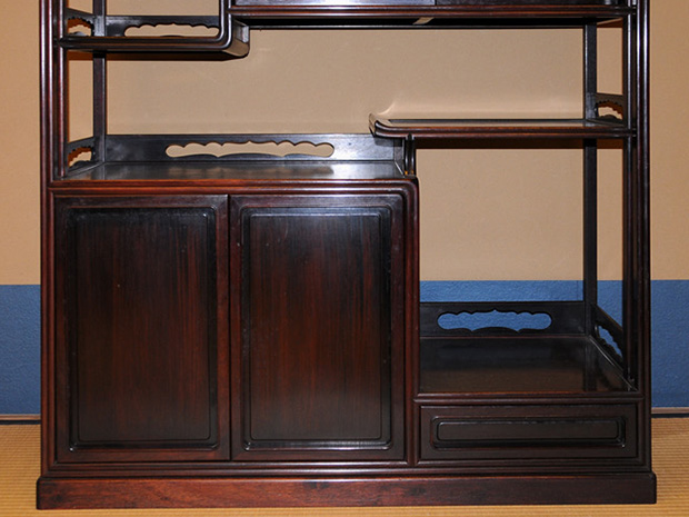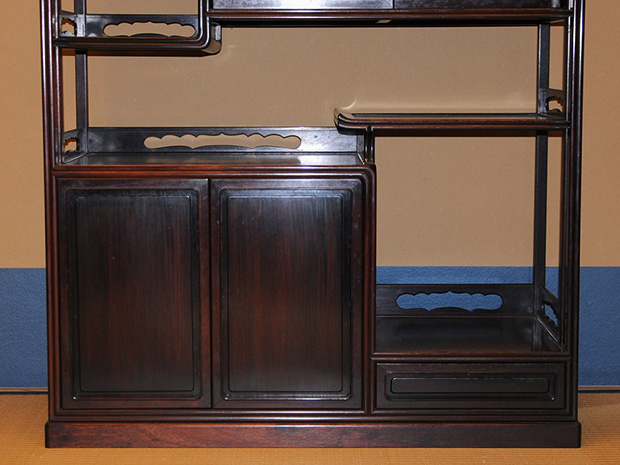 中国美術 唐木 透かし彫 違い棚 です。 唐木の落ち着いた色合いが味わい深い作品です。 天袋も落ち着いた色合いの唐木のアクセントに感じられます。 格調高い作品に仕上げられています。 時代相応のアタリや経年変化はございますが、大きいダメージはなく全体的には良い状態です。