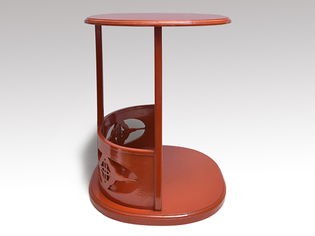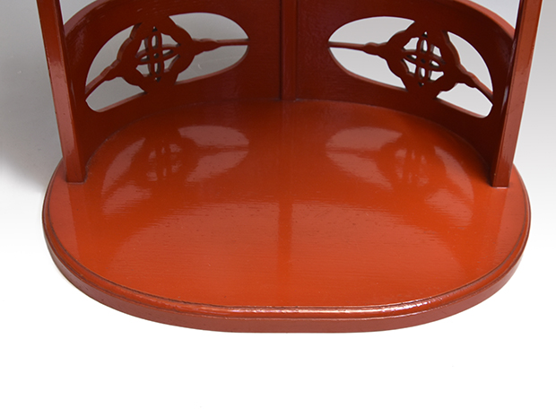 30年ほど前に製作された朱の目はじき塗の冠棚です。 上部に冠を置いておいた棚を基に茶道用に考案された棚です。