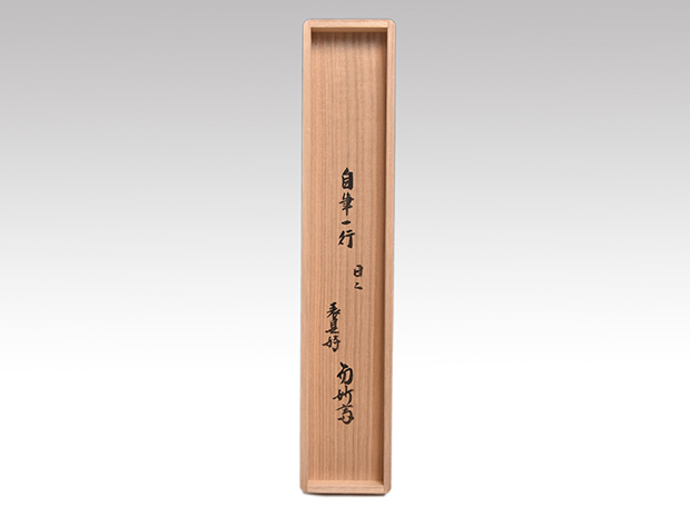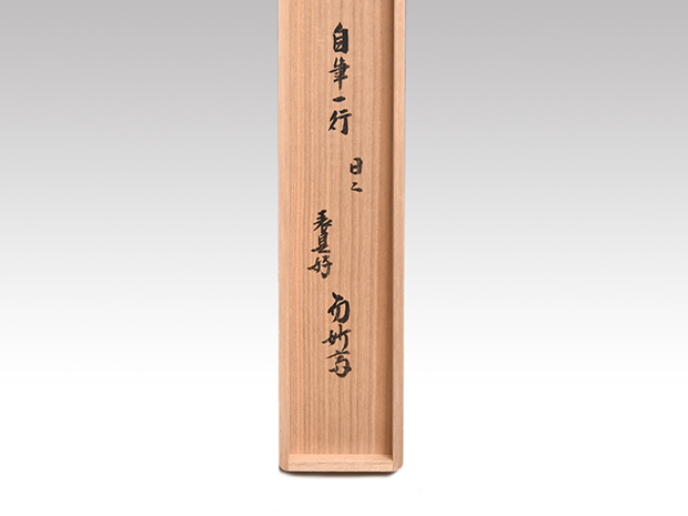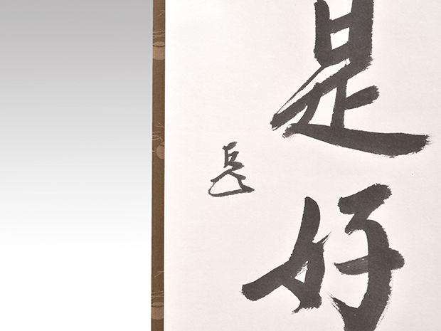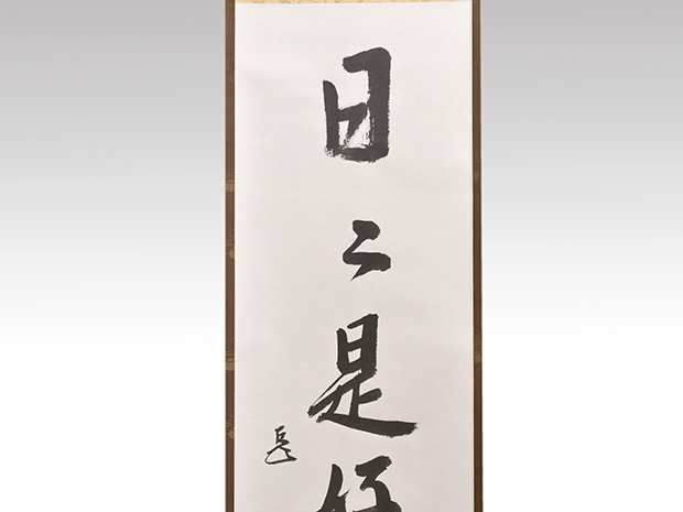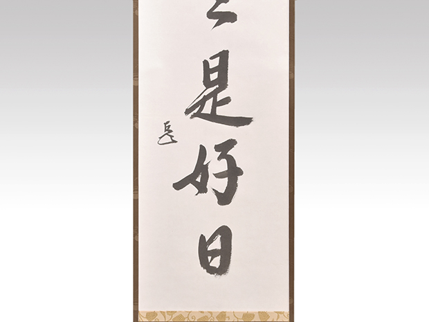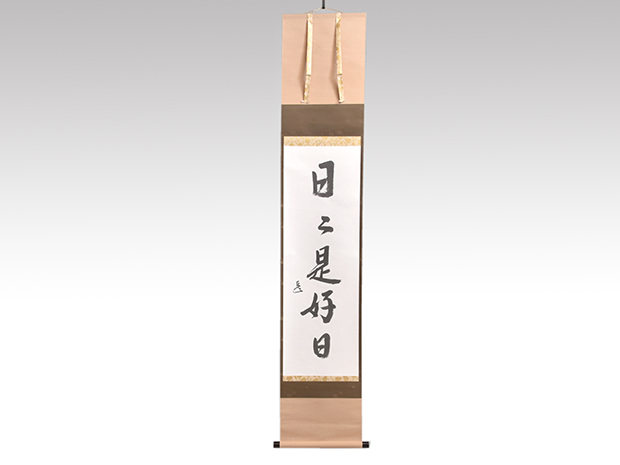 表千家十四代家元而妙斎宗匠が揮毫した「日々是好日」の一行書です。 その日その日が最上であり、最高であり、かけがえのない一日であって、日々の、苦しみ、悲しみ、喜び、楽しみなどこういった良い悪いに対する執着がなくなり、今日を素直に受けとめ、自然の中で生きているということを感じ、1日を意のままに使いこなす、すごせる、というところに真実の生き方がある、