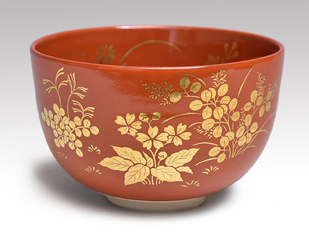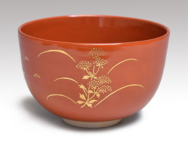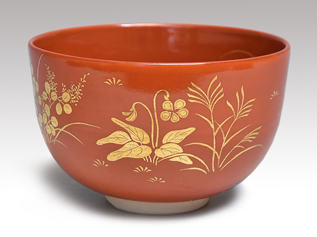 朱地金彩 四季草花茶碗 あかね窯 岡田華溪(作) 共箱