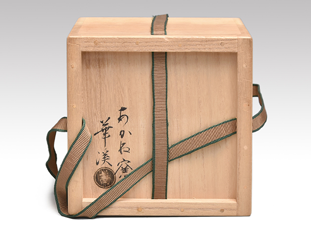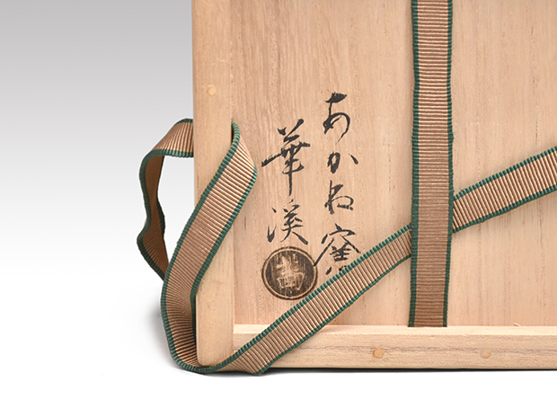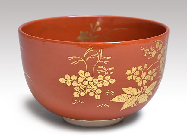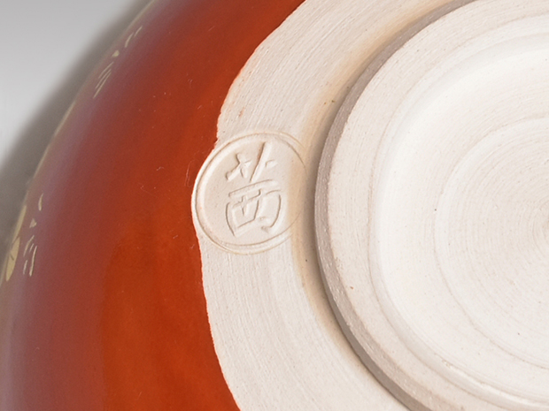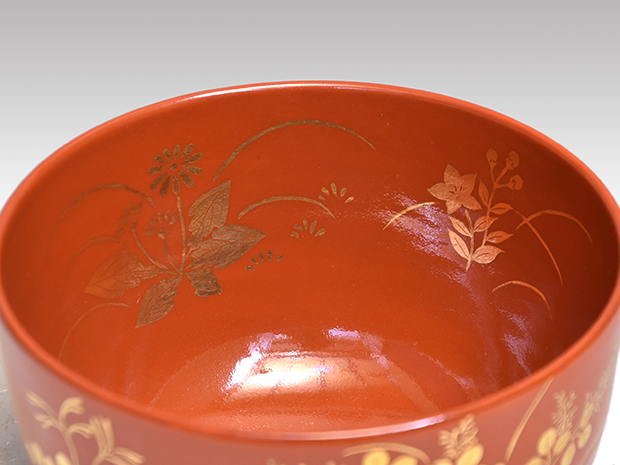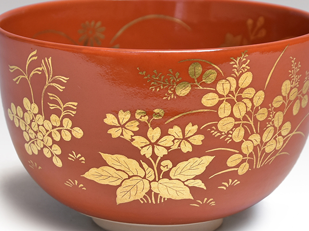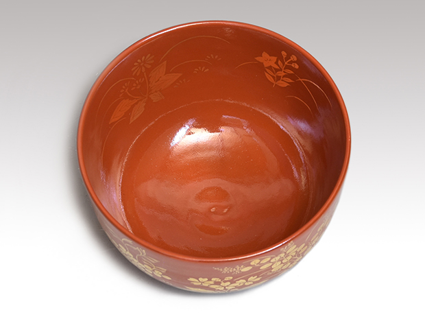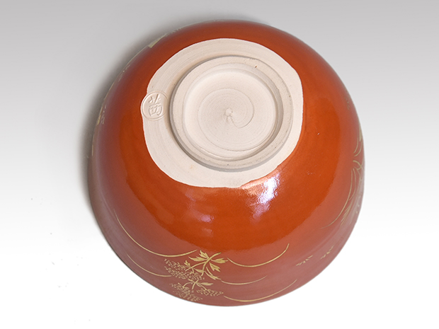 全体に朱薬を施した上に内外に四季草花(菫、桜草、薄、女郎花、萩、たんぽぽ、桔梗)が金彩で描かれている大変豪華な茶碗です。 高台脇に茜の丸印が捺されております。 書付用の上等な桐箱に納められております。 殆ど使用してなく良い状態です。