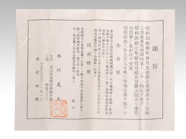 西村義光 労働大臣指定優秀技能賞受賞の経歴をもち、高岡銅器の伝統工芸産業の保持者