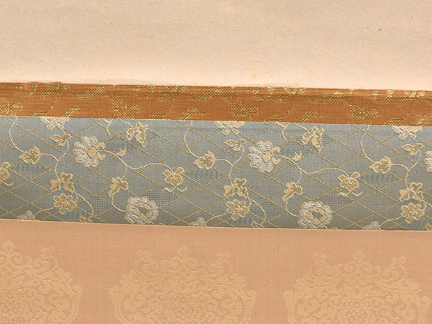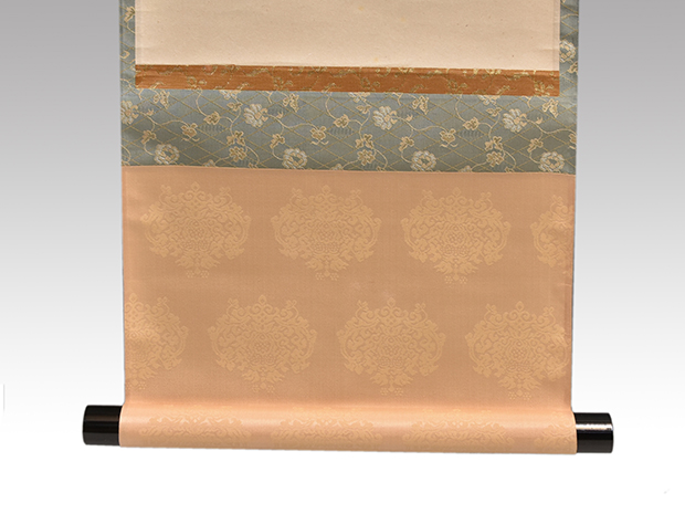 金泥で松の葉が松月により描かれております。表具は一文字・花唐草金襴、 中回し・花唐草緞子、上下、牡丹文緞子の上等な表具で良い状態です。