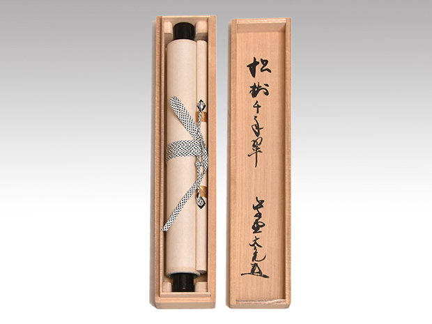 「松樹千年の翠、時の人の心に入らず」すなわち、松が幾多の風雪にも屈することなく緑を保ち続けている堅固さに世の人々は気が付かない、という句から採られた言葉で、いつまでも変わらない松の緑に託して、長寿や多幸を祈り、正月の席に用いられ季節を問わずご使用できます。