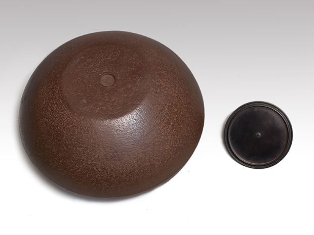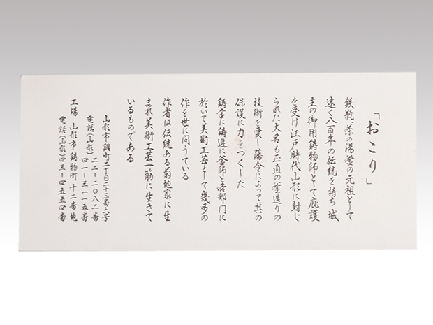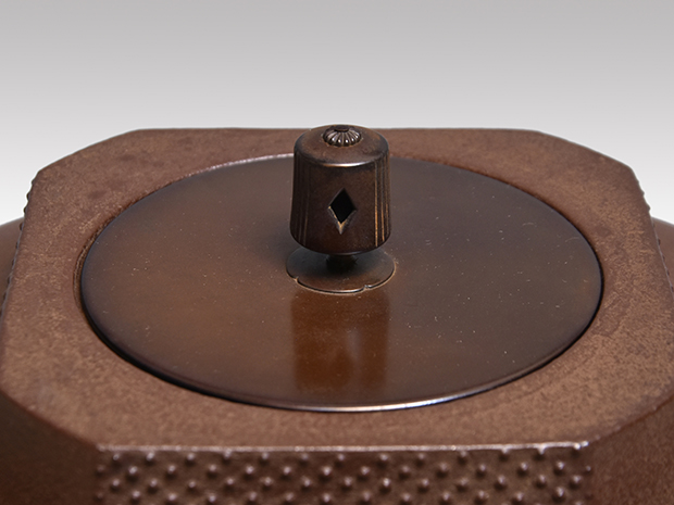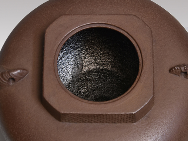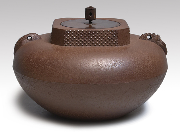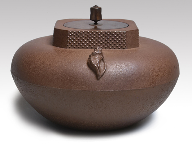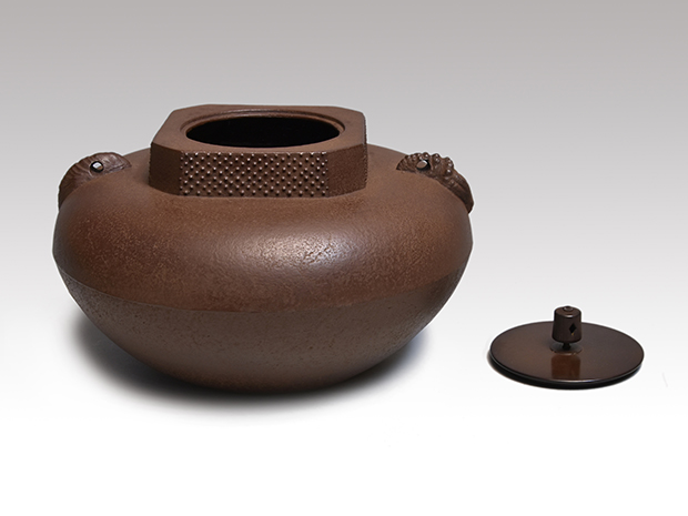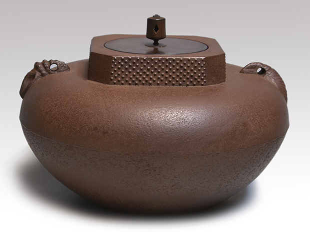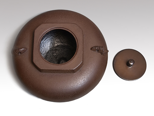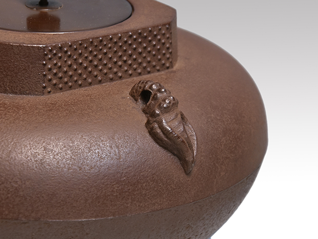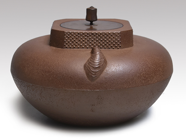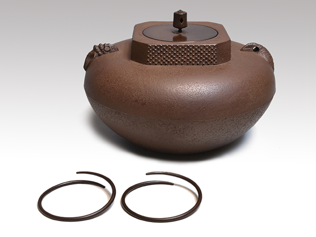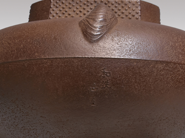 初代、長野垤志と製作していた頃の和ずくで製作した釜です。 口は甑に立ち上がり八角で四面に霰が打たれ姥口となっております。 鐶付は二種類の貝をそれぞれに鋳出しております。 鐶付の下に「和銑 正直」と銘が鋳出されております。 高さが低いので女性でも取り扱いやすい釜です。 未使用で良い状態です。