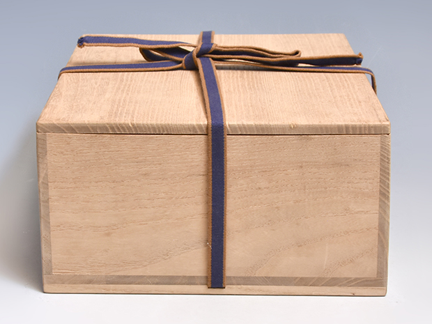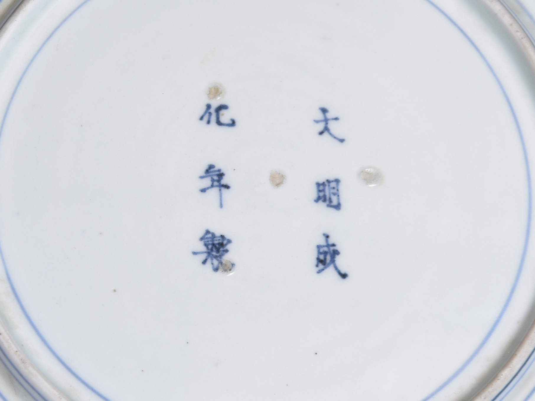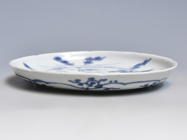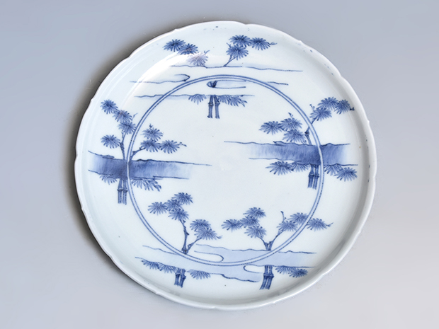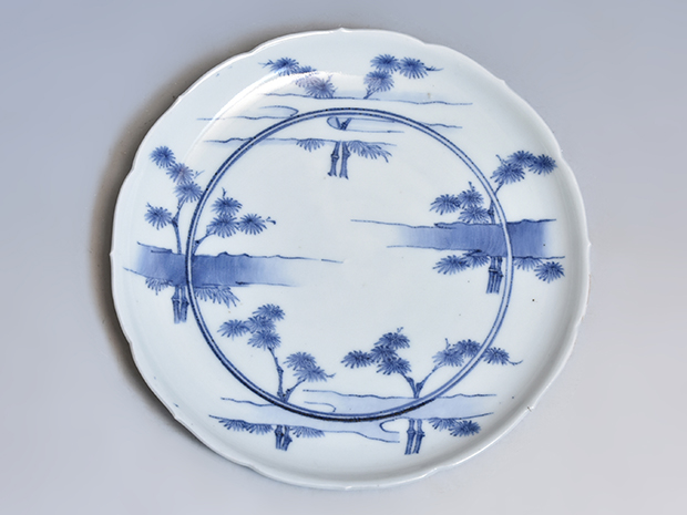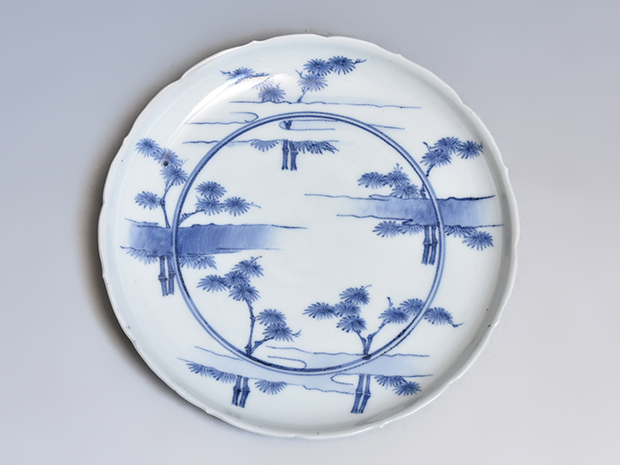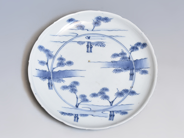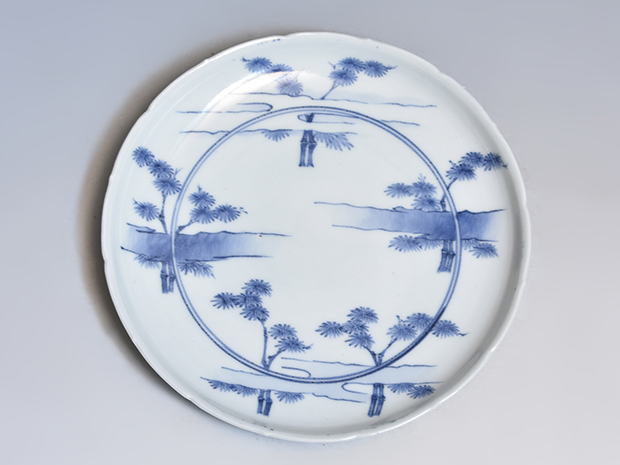 見込みには二重罫線が引かれ、その間に五方へ竹文が端正に描かれています。 竹は生命力や長寿を象徴する縁起の良い意匠で、器面に清々しい雰囲気を添えています。 器形はわずかに輪花を帯び、裏面には細やかな唐草繋ぎ文が一周巡らされています。 キズ等もなく、良い状態です。