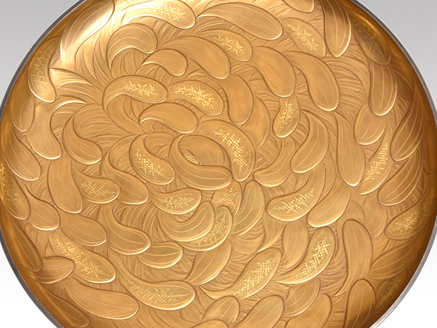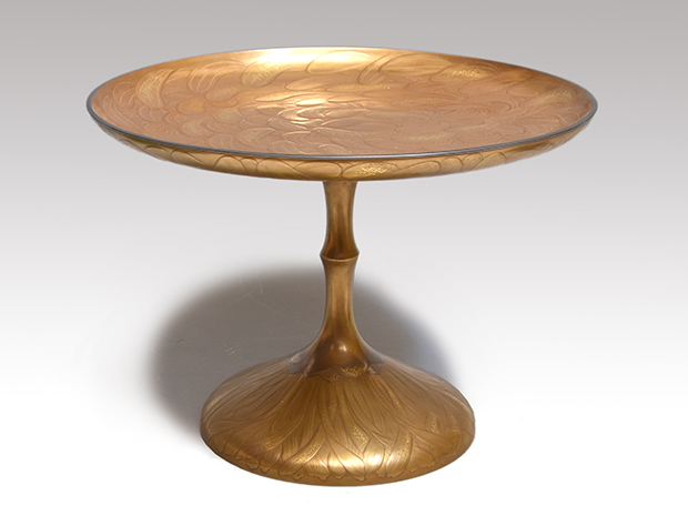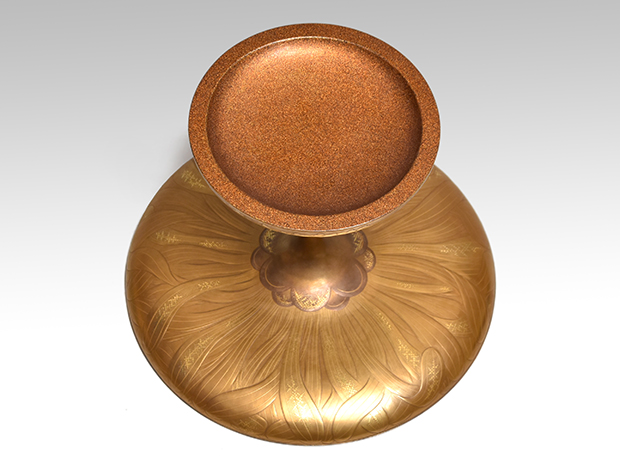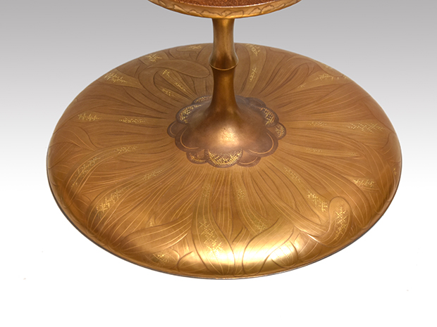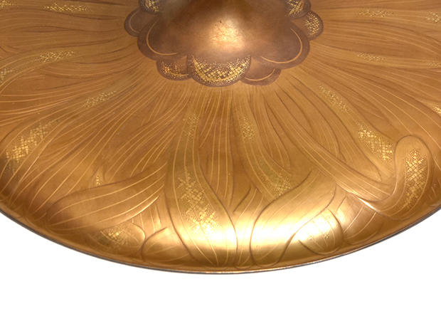 全面に最高級の花弁高蒔絵を施した大変豪華な高坏です。 全体を花弁一枚一枚を高蒔絵し、金地の上に金の切金を置き、葉脈も丁寧に金線で描いております。 足の部分は繊細で底の台にも花弁が重なり見事な蒔絵です。 底は細かで上品な梨地が施されております。 キズ欠点なく良い状態です。 現在では製作出来ないレベルの蒔絵です。