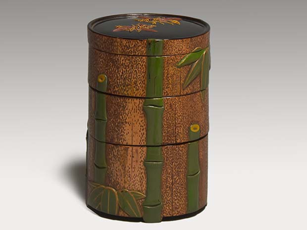 側面には盛り上げで青竹が蒔絵され蓋には蜂二匹が蒔絵されております。