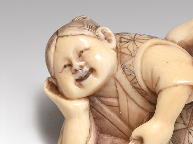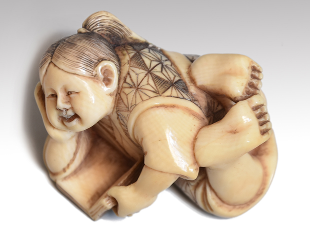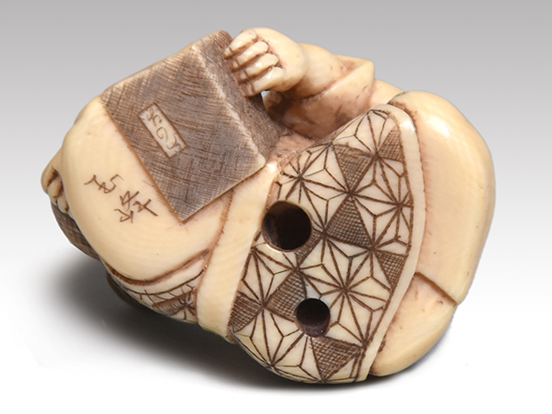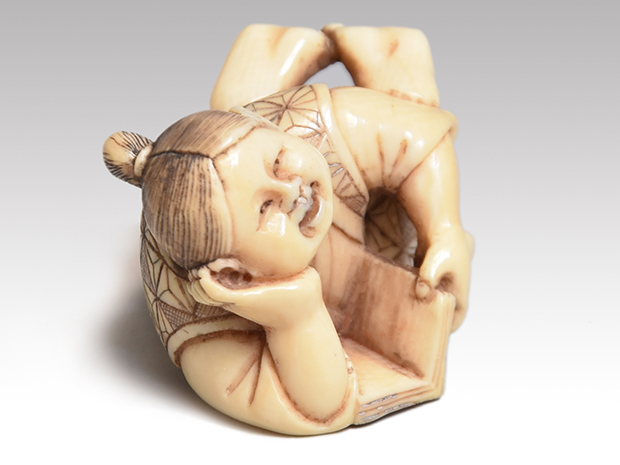 象牙根付 人物像(本を読む童) 銘「玉峰」