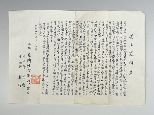 | 作者 | 9代 長岡住右衛門(長岡 空味) 明治7年(1874年)〜昭和35年(1960年) 島根県に生まれる 通称住右衛門 号は空味 1716年頃、松江藩主松平不昧候が同地の焼き物であった楽山焼(4代加田半六の頃)廃絶の危機に対し、布志名焼陶工であった住右衛門を招いて5代楽山焼窯主として再興を模索したのが始まりである。 以降長岡住右衛門を継承して代々松江藩の御庭焼として制作を続けている陶家で楽山焼の9代目 また長岡住右衛門としては5代目となる 現在は代数の多い9代長岡住右衛門と称す方が通例となっている |