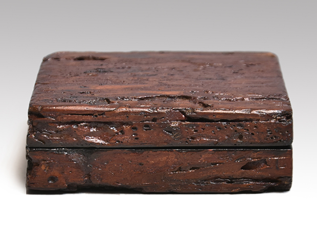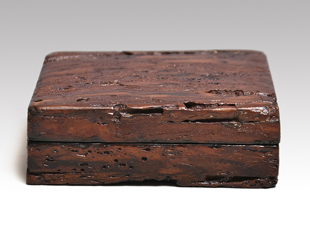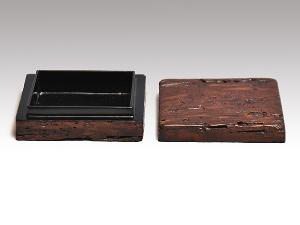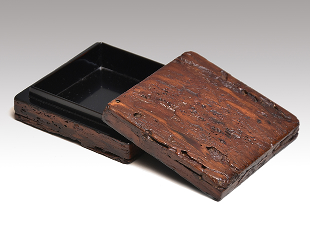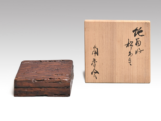 益田鈍翁好の松の木で製作した角香合です。 外側は荒々しい松の皮の部分を使用して内側は真塗で丁寧に仕上げられております。 立花大亀老師の箱書が備わっております。 未使用でキズ欠点なく良い状態です。