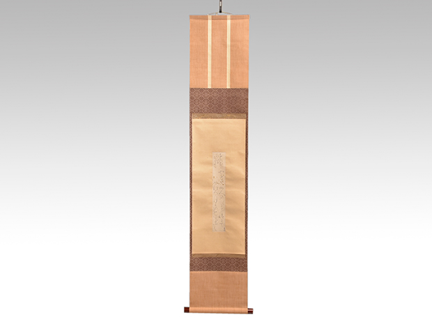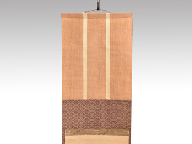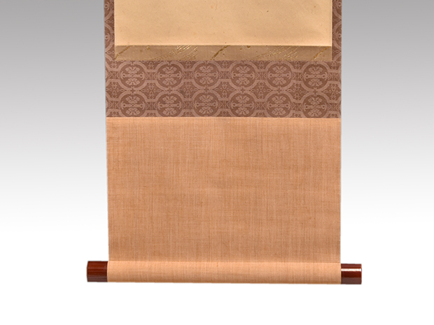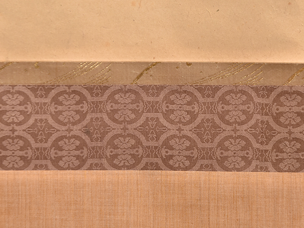 表具は京都藤岡光影堂製で一文字、波千鳥金襴 中回し、花文緞子 上下、しけの時代の裂地を使用した上等な表具で良い状態です。
