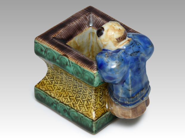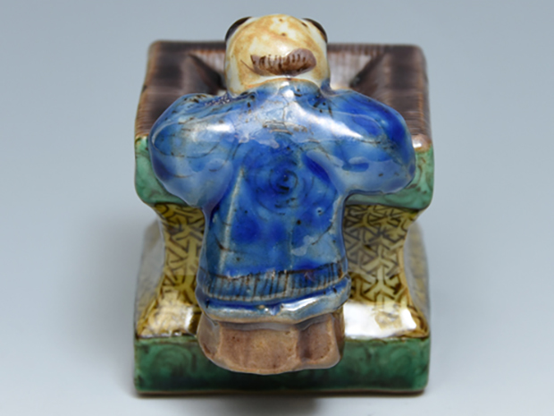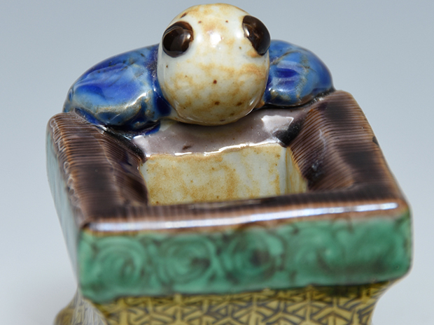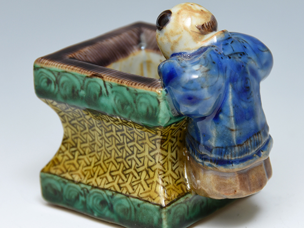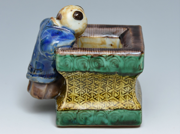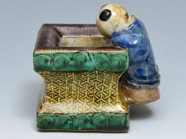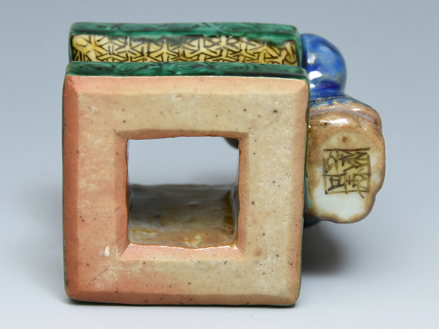 須田青華(造)九谷焼 吉田屋一閑人蓋置です。 江戸時代後期に焼かれた「吉田屋」を彷彿とさせる見事な色合いで一閑人が可愛らしく造形されている愛らしい蓋置です。 唐子の足裏に銘あり。 多少の経年変化見られますが、状態は良好です。