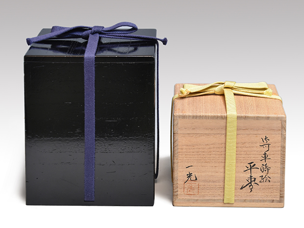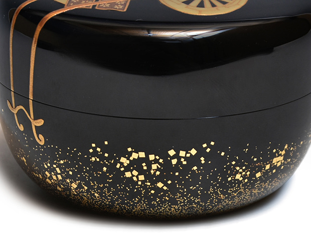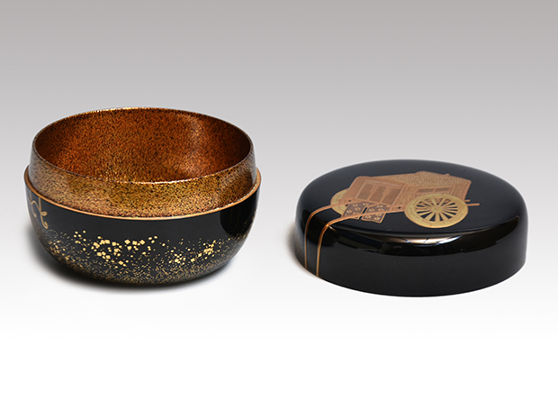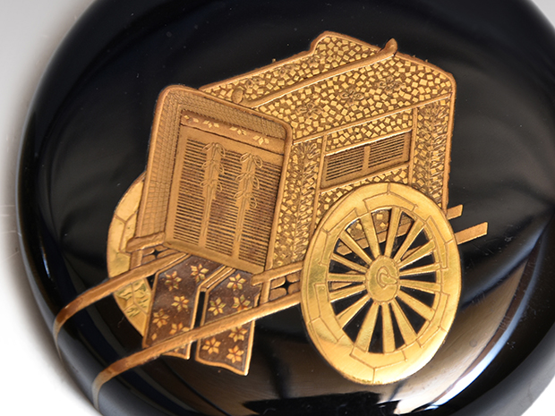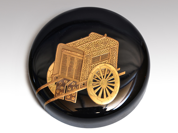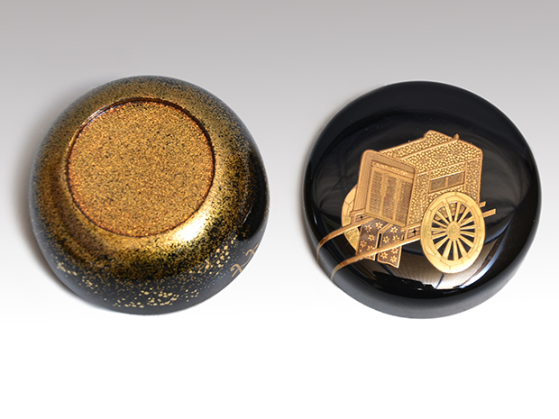 真塗地に蓋の甲には御所車が金地、梨地、切金、金板で蒔絵されております。 下部には切金と梨地が施されています。 内側と底も豪華な梨地仕上げで、細部にまで気を配った造りです。 蓋裏には即中斎の朱による花押が記され、品格を添えています。 未使用ですので良い状態です。 葵祭りや時代祭りなどの取り合わせや平安貴族の取り合わせ等ご使用できます。