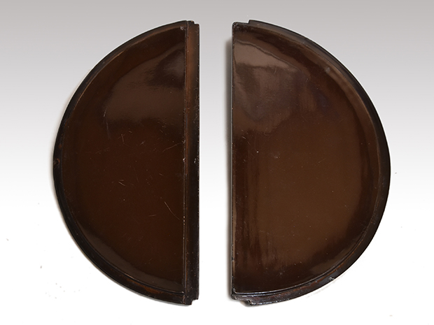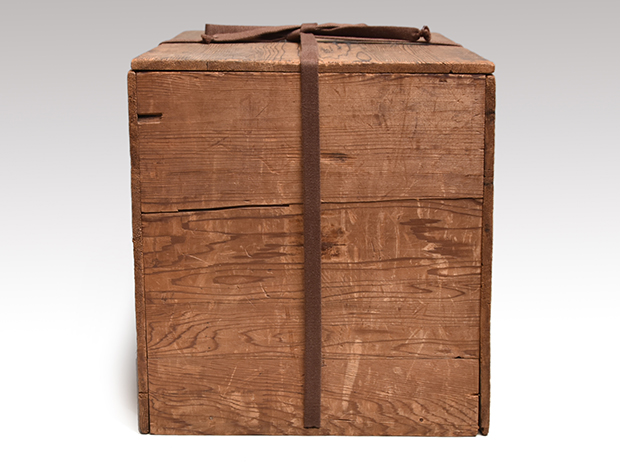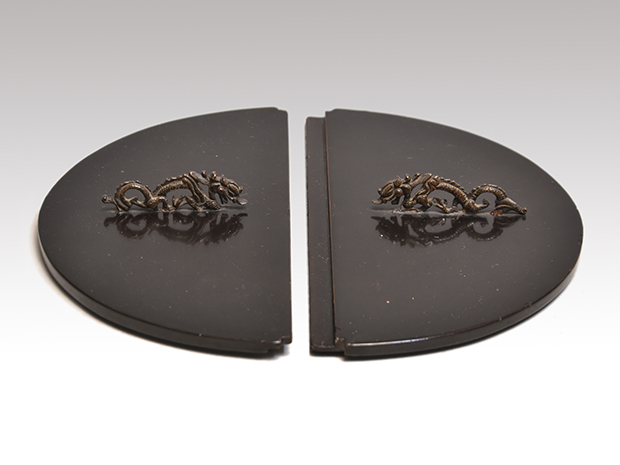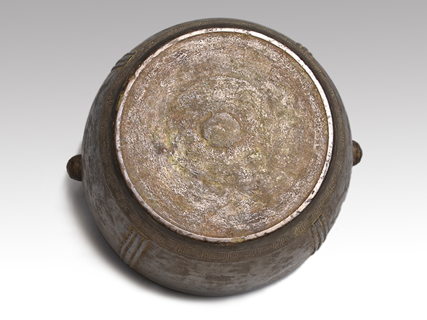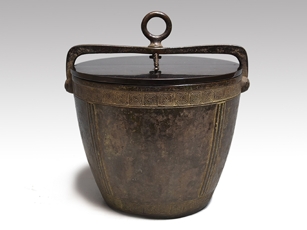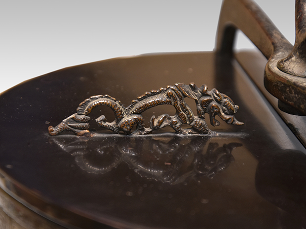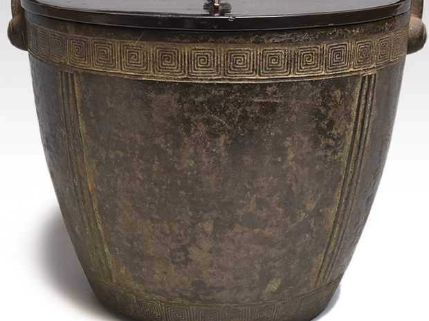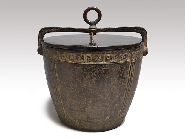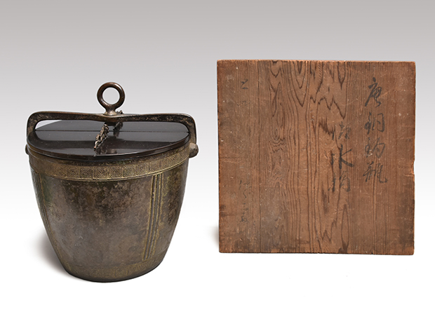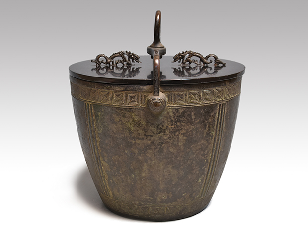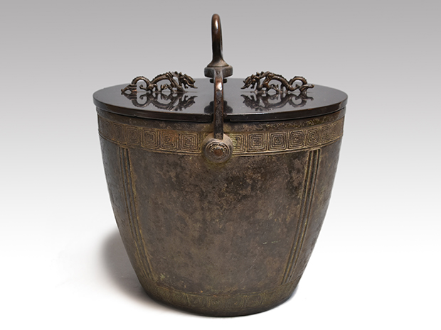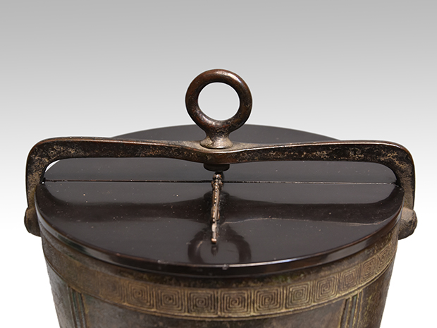 時代の唐胴製の水指です。 上部の鐶は回ります。 上部と下部に、雷文を廻らせ胴には四分割の三本線が浮き出ております。 蓋は古い時代の塗蓋で龍の透かしの古い金具がついております。 大変珍しい水指です。