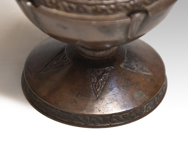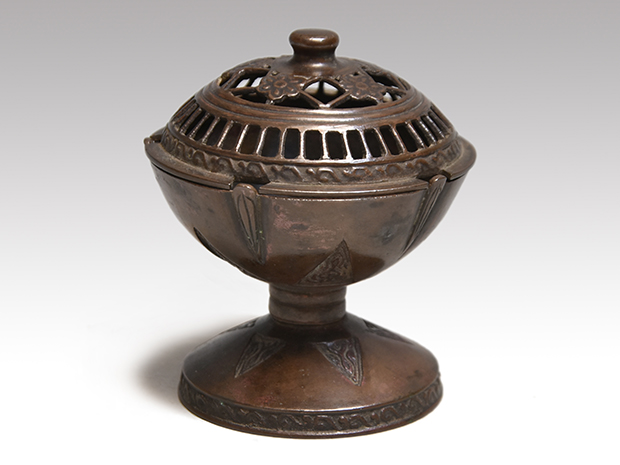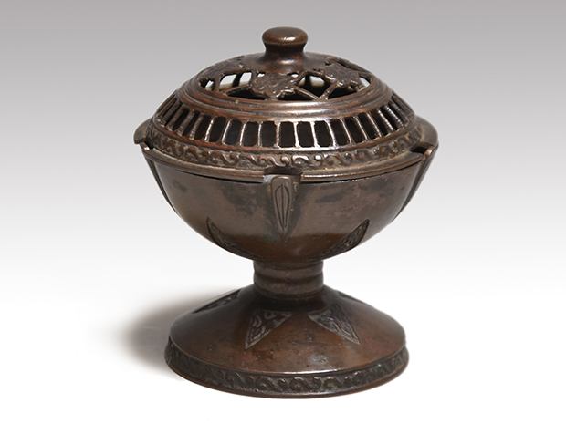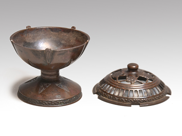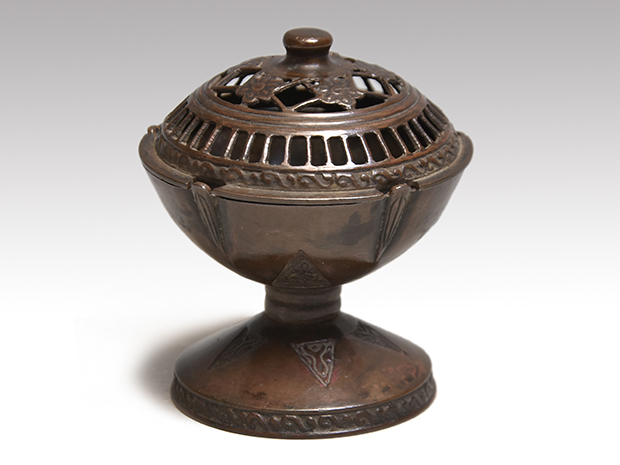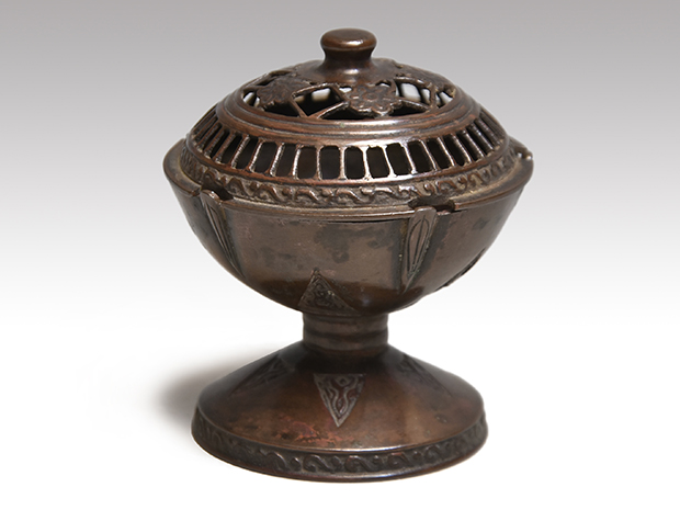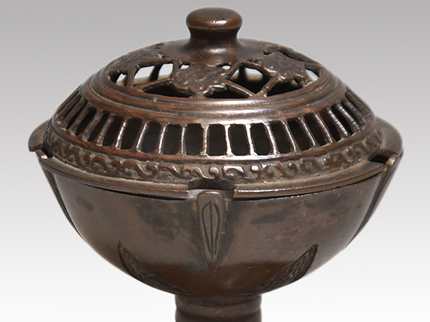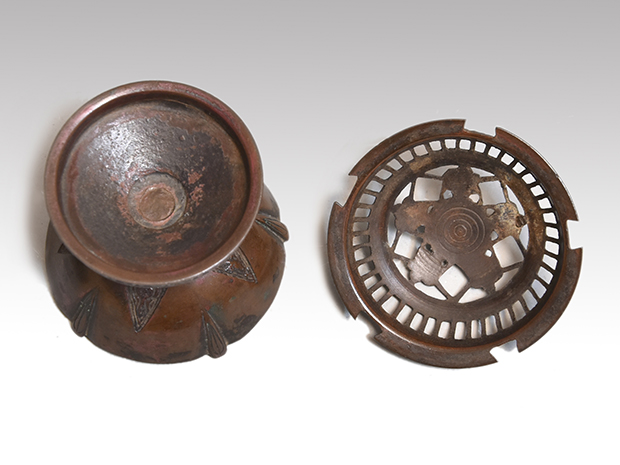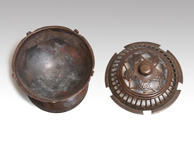 時代の古銅の火屋香炉です。 蓋の透かしは花文と透かし文が施された珍しいタイプです。 下側も丁寧な作りで台座の縁にも細かな文様が1周廻っております。 良い色合いでキズ欠点なく良い状態です。