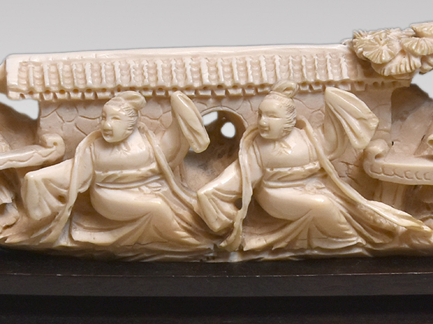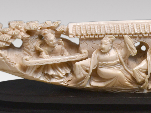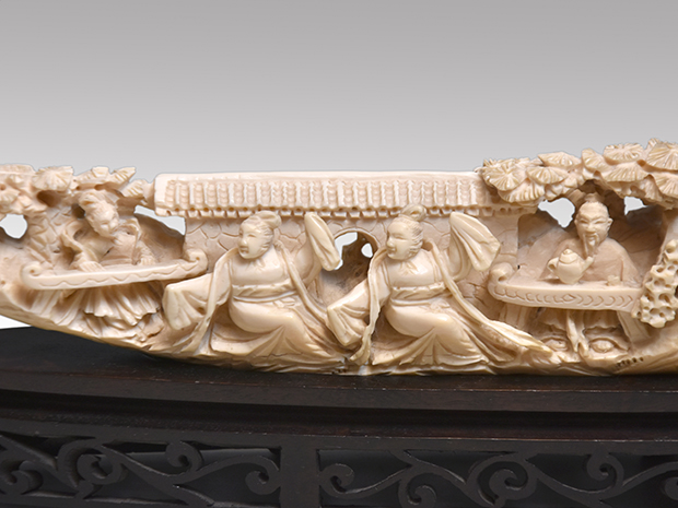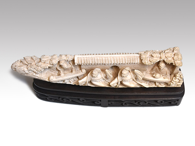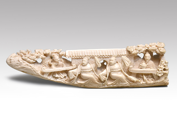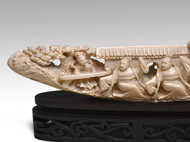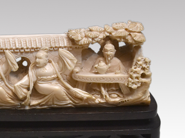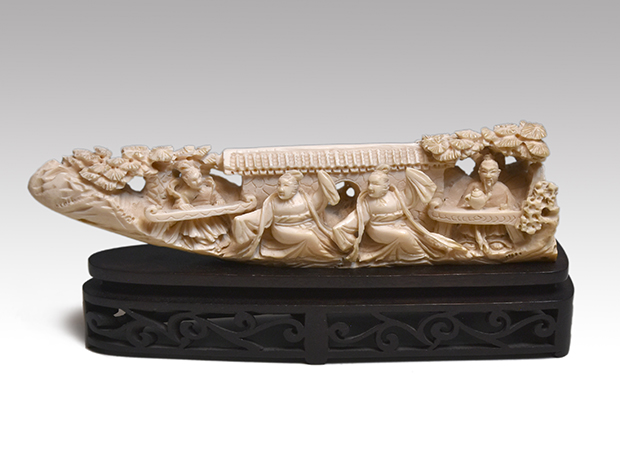 | 商品説明 | 象牙の先端部分を使用して製作した楼閣人物図です。 茶を飲んでいる文人と琴を弾いている婦人、舞いを舞っている二人が彫刻されております。 100年ほど前の中国で製作された品で良い状態です。 |
