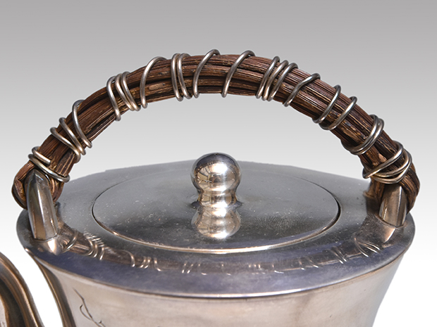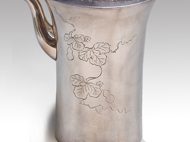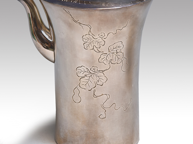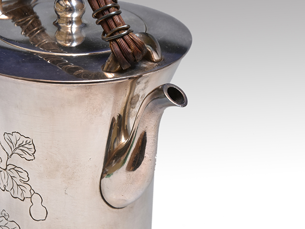 | 商品説明 | 明治18年に九代 中川浄益が製作した2合入りの銀製酒器一対(2点)です。 胴には夕顔の彫金が優美に施されております。 胴の側面には「中川浄益造」と銘が刻まれております。 持ち手も藤に銀線が補強とアクセントで巻かれております。 殆ど未使用のためにとても良い状態です。 明治18年の領収書も備わっております。 |