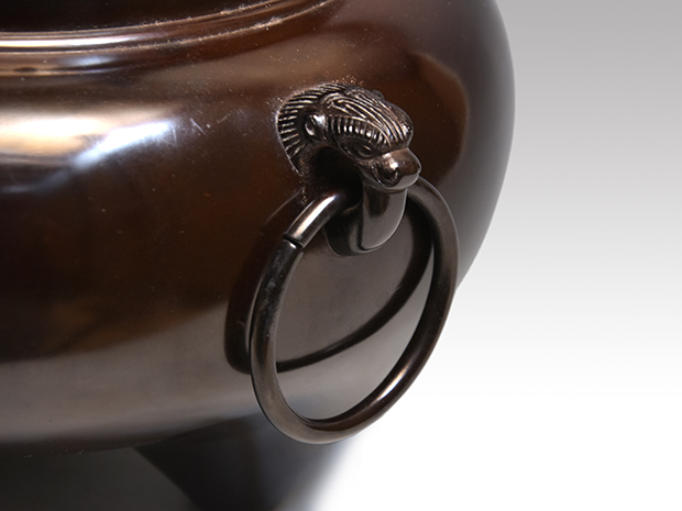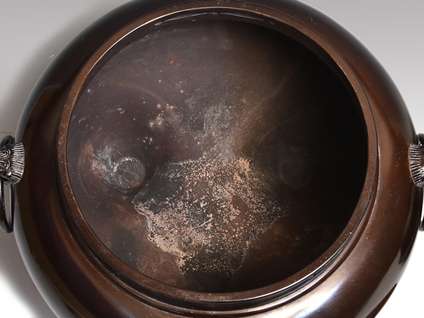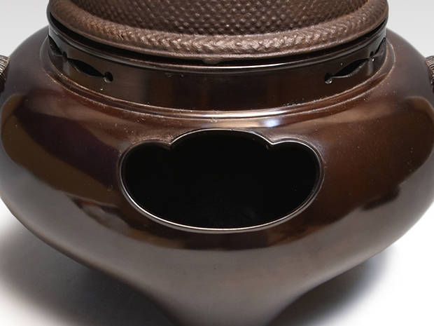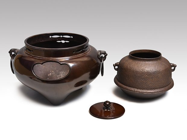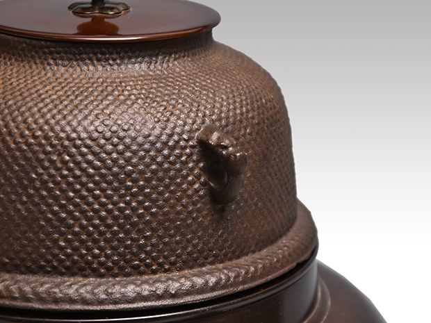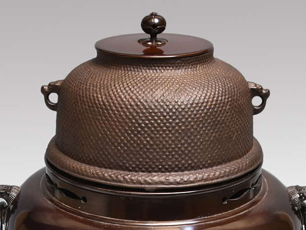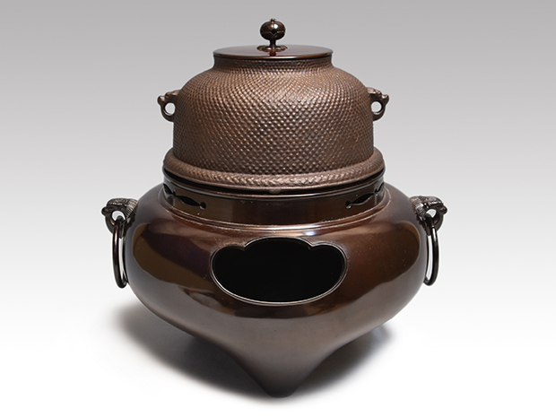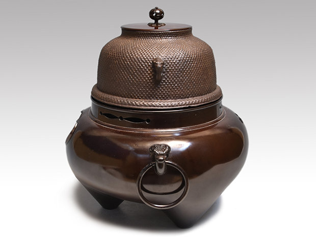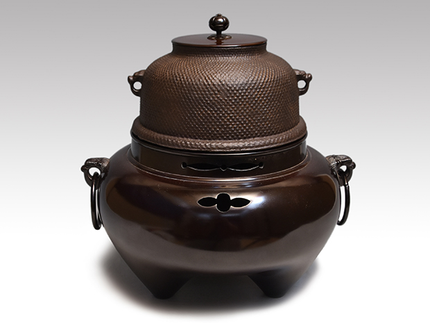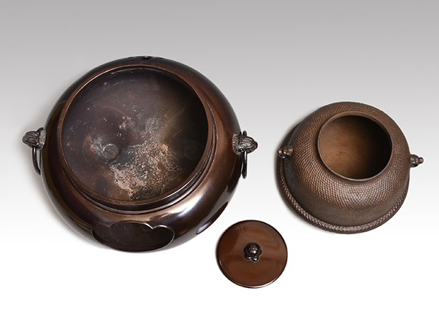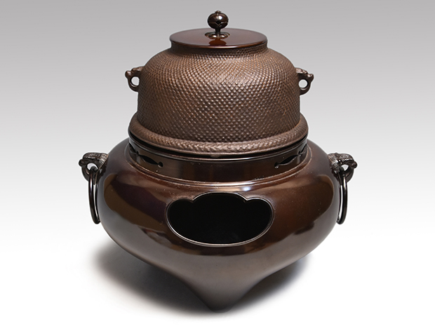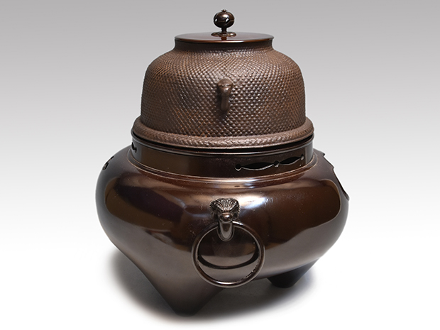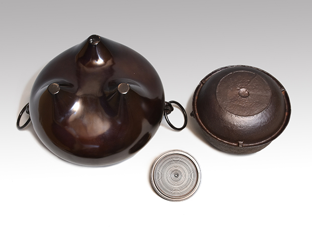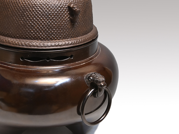 釜:口径:10.3cm 胴径:17.8cm 羽の径:19.7cm 上蓋ツマミまでの高さ:17cm 重量:約2kg 風炉:口径:20cm 胴径:28.3cm 高さ:18.8cm 重量:約4.5g 全体の高さ:30cm(上蓋ツマミ含む)