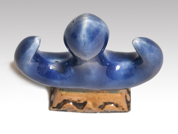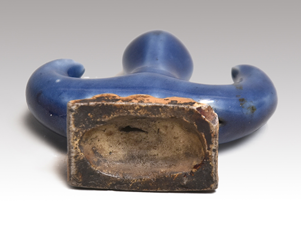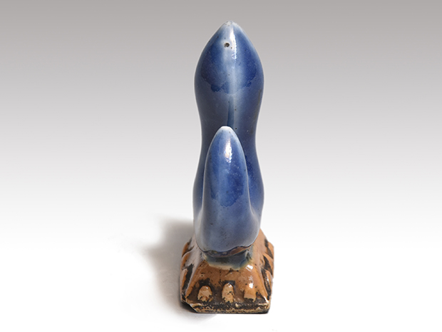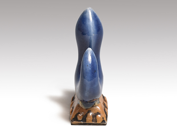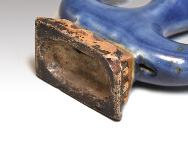 | 商品説明 | 初期伊万里の希少な三叉槍形筆架(ひっか)です。 独特な造形美で深みのある瑠璃釉が全体を覆い、光の加減で美しい青の濃淡を楽しめます。 下部にはビスケットのような温かみのある色合いの釉薬が施され、瑠璃釉との対比が一層際立ち、素朴さと華やかさを併せ持つ趣を感じさせます。 筆置きとしてはもちろん、観賞用の古陶としてもおすすめできる一品です。 初期伊万里ならではの力強さと柔らかさが同居する逸品をぜひお手元でご堪能ください。 |