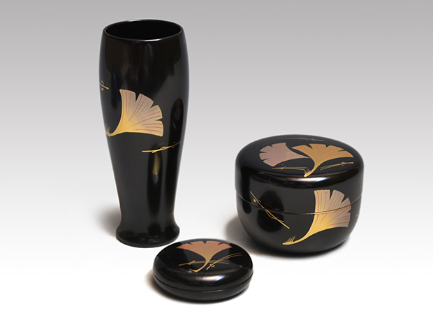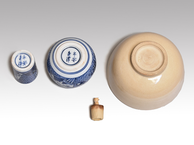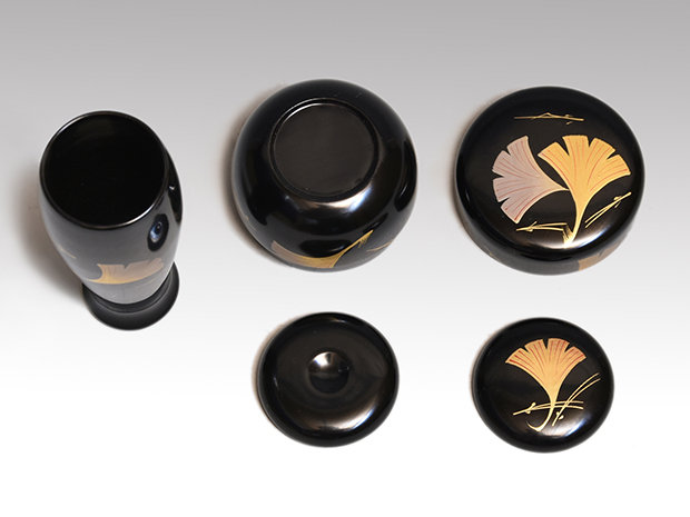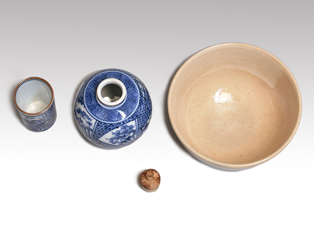 | 寸法 | 茶箱:縦21.5cm 横14.5cm 高さ:12.8cm 茶碗:口径:11.3cm 高さ:6.7cm 棗:径:6.5cm 高さ:5cm 香合:径:4.8cm 高さ:1.5cm 茶杓:全長:16.3cm 重量:4.2g 振り出し:口径:2.5cm 胴径:6.8cm 本体の高さ:7.5cm 上蓋ツマミまでの高さ:9cm 茶筅筒:口径:4cm 胴径:4.5cm 高さ:11.2cm 茶巾筒:径:3.5cm 高さ:5.5cm |