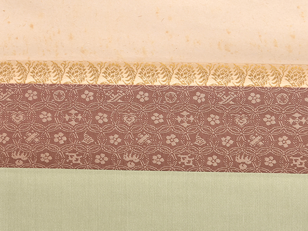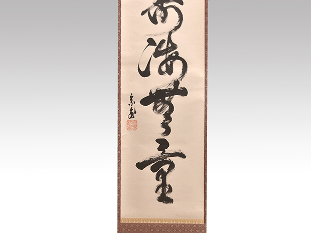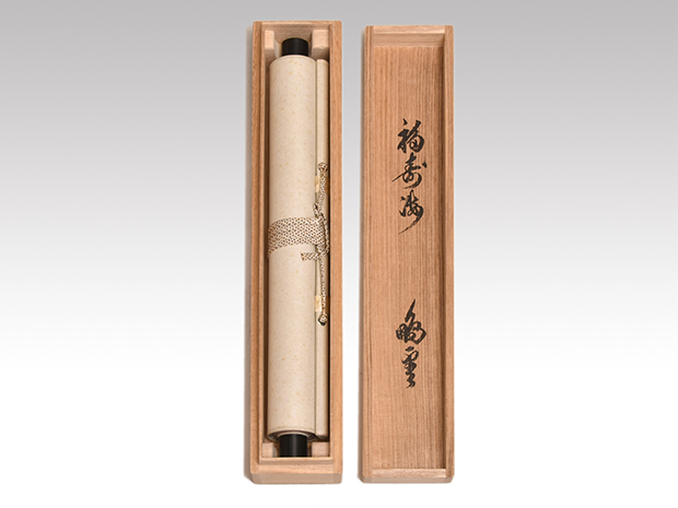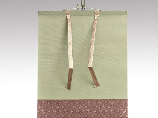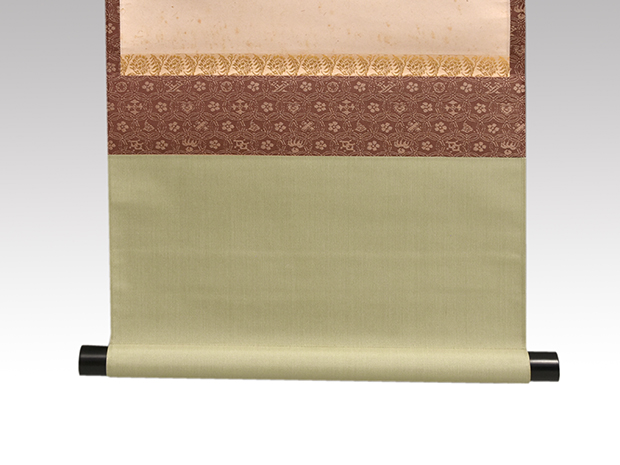表具は京都、清好堂で一文字・牙色地唐草本金襴 中回し・紫地宗薫緞子 上下・鶯色節斜子でわずかな巻きしわ、ほとんど目立たない糊しみがございますがお席で十分ご使用できます。