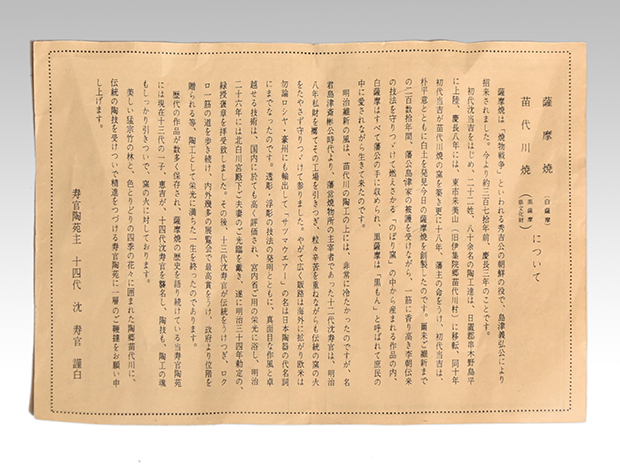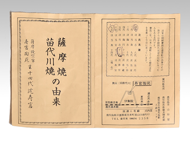 | 作者 | 薩摩焼宗家 十四代 沈 壽官 (1926年(大正15年)~)は13代の長男で本名は大迫恵吉(おおさこ けいきち)。 1964年の13代の死去に伴い沈家当主と沈壽官の名を継いだ。司馬遼太郎と親交があり、司馬の小説『故郷忘じがたく候』(1969年刊)の主人公のモデルとなった。 1989年に国内初の大韓民国名誉総領事に就任するなど、日韓の文化交流に努めたことでも知られている。 |