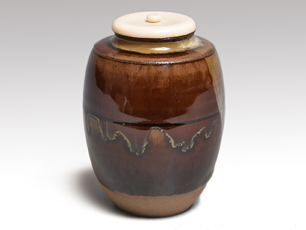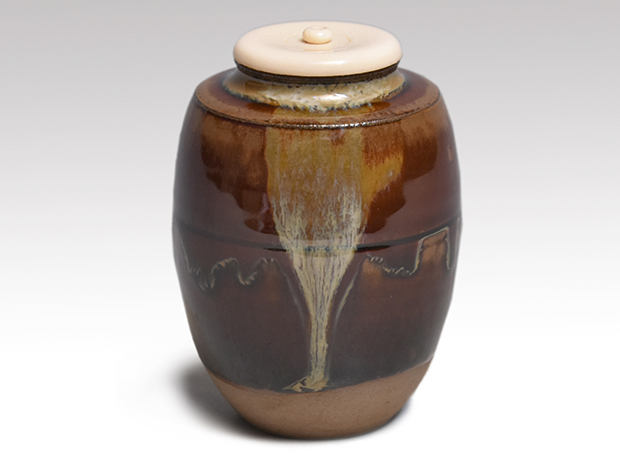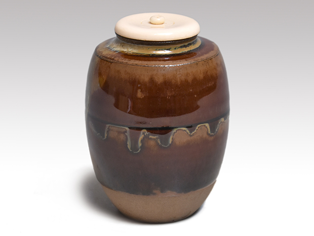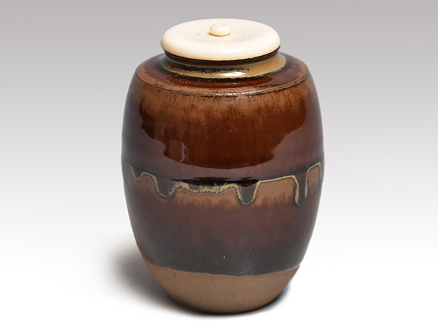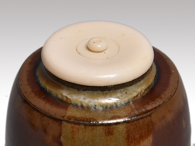 高取焼 肩衝茶入 高取喜恵(作) 共箱 象牙蓋 仕覆(龍文金襴)遠州七窯