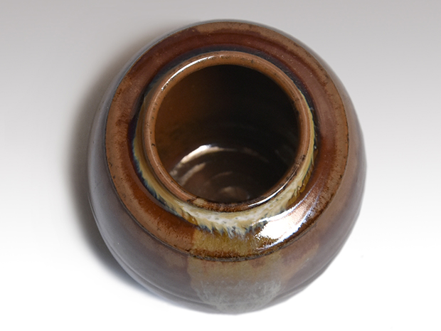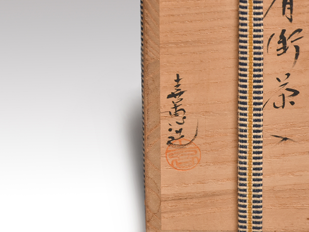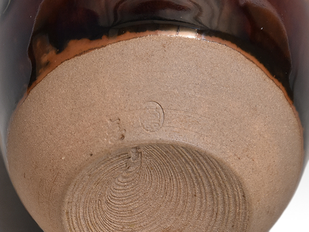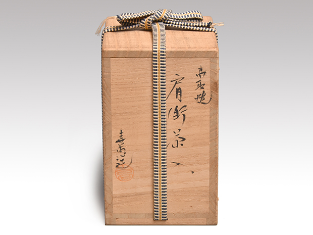 丁度良い大きさの薄手の肩衝茶入です。 腰に胴紐を巡らせ正面の釉薬が絶妙に掛かっております。 胴紐より下側は幻想的な釉掛りです。 高台脇に丸に「高」と「喜」の二印が捺されております。 未使用でキズ欠点なく良い状態です。