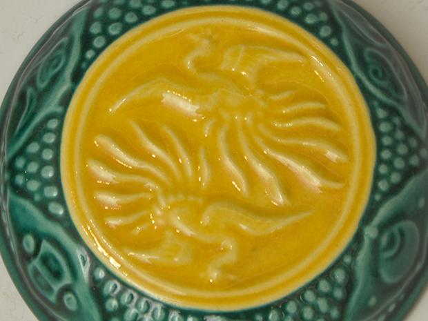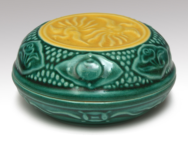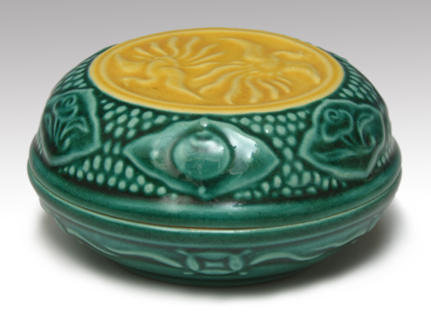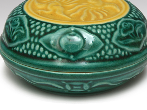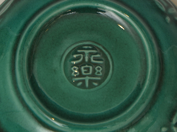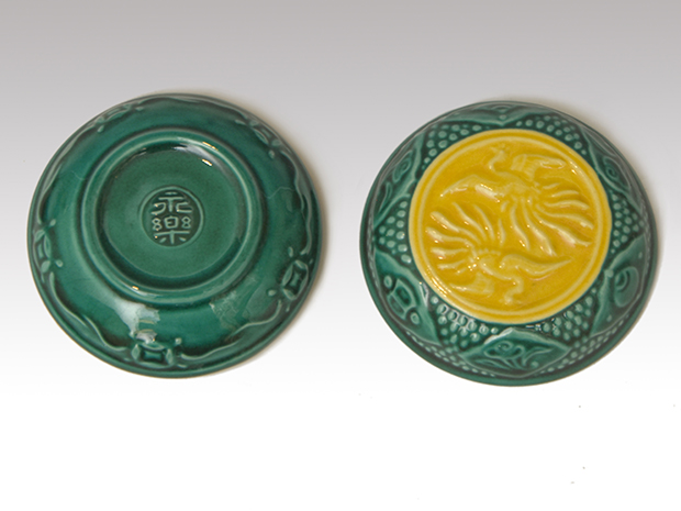 | 商品説明 | 十六代 永楽善五郎(即全)作の交趾羽衣香合です。 蓋の黄交趾部分に鳳凰が二羽、翔ばたいており側面の青交趾の部分は、宝尽文様を廻しています。 下部は七宝繋ぎ文です。 高台内には「永楽」の丸印が捺されております。 ほとんど使用してなく良い状態です。 |
