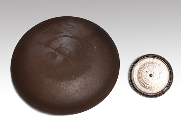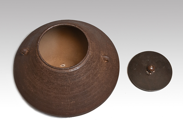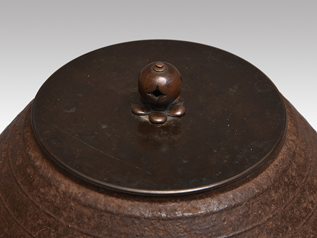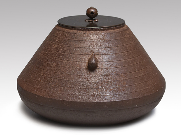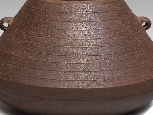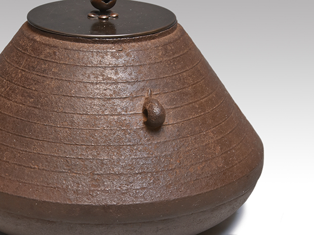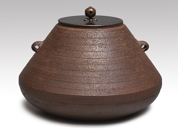 桃山時代、博多芦屋で製作された富士山の形の釜です。 博多芦屋は色々なデザインの釜を製作し筑前芦屋に近い一大拠点です。 下から上まで10本の筋が施されあたかも一合目から十合目まででしょうか? 鐶付は茄子です。 底は替え底となっております。 漏れはなくすぐにご使用できます。