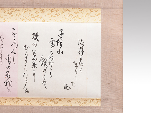 色の継ぎ紙に益田鈍翁の自営の和歌が認められております。 和歌は「強羅にゆくおりしも 鈍 箱根山 雪みのなりし 〇のこそ 杉の葉末に なりわたるみゆ ふりつみし 雪の箱根を 長閑にも 東の窓に 見つつゆくかな」 箱根の雪の景色を詠んだ和歌です。 表具は一文字金襴、中回し、上下共、しけの落ち着いた良い表具で良い状態です。