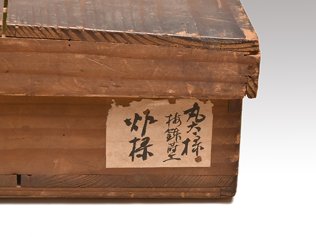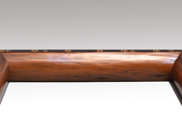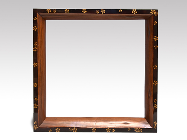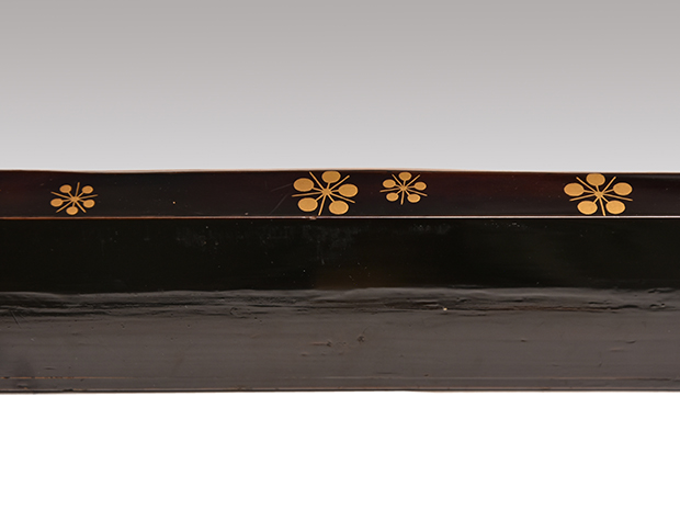 江戸時代の磨き丸太を使用して上面に漆を塗り繊細な梅鉢蒔絵が大小39個蒔絵されております。 丸太の時代による照りも見事です。 古い箱に「利休形 炉縁」と書いてあります。 お洒落な炉縁で概ね良い状態です。