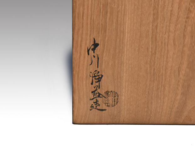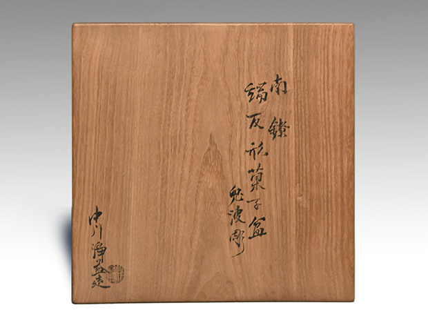 | 作者 | 十世 中川浄益(1880年~1940年) 千家十職の一つ、金物師(かなものし)の中川家当主が代々襲名する名称。 元々は越後国で甲冑・鎧を作っていたが、茶道具を初めて手掛けた初代・中川與十郎が紹益を名乗り、二代目浄益以降の当主は浄益という名を継いでいる。 九代淨益の長男として生まれ家業を継承。 若年の頃、大阪の道具商に商売見習いに丁稚奉公に行き、その後、培った経営方針により先代が残した借財を返済し以降の中川家安定への基盤を作る。 作品では「一燈好老松皆具」、「認得斎好朝顔彫火箸」、「淡々斎好渦彫炉灰匙」などを残すが、晩年は本業のほかにも俳句、能楽、画、浄瑠璃など文芸一般に長じた。 |