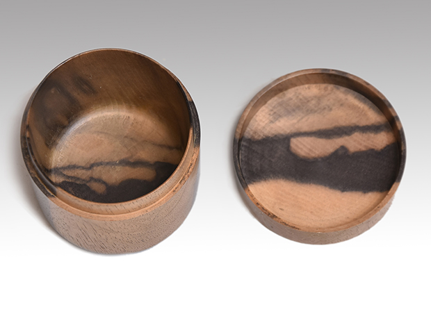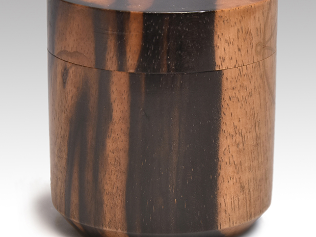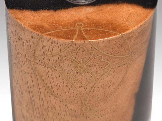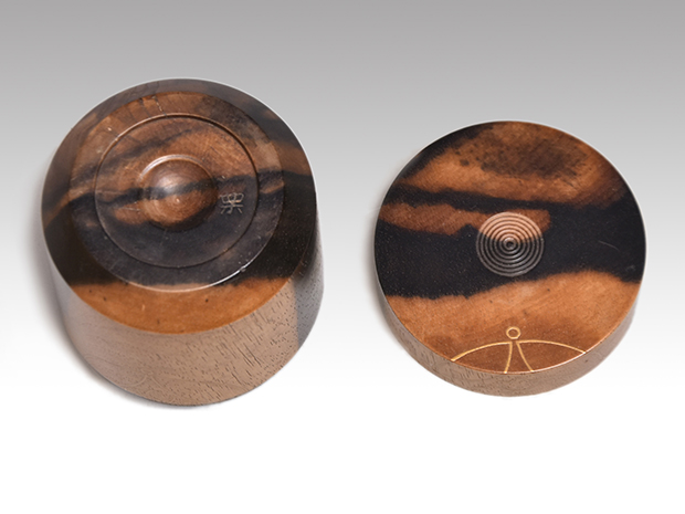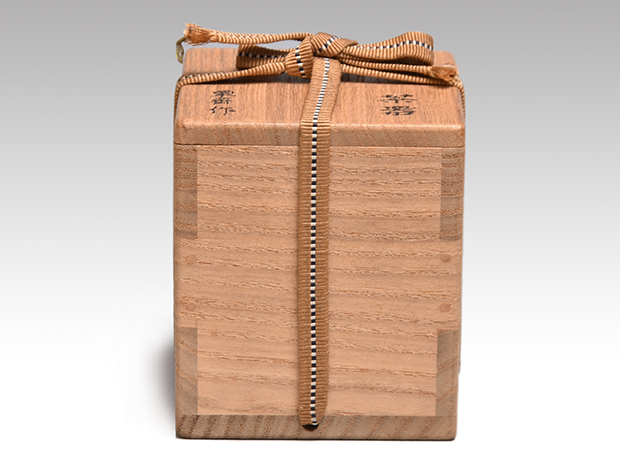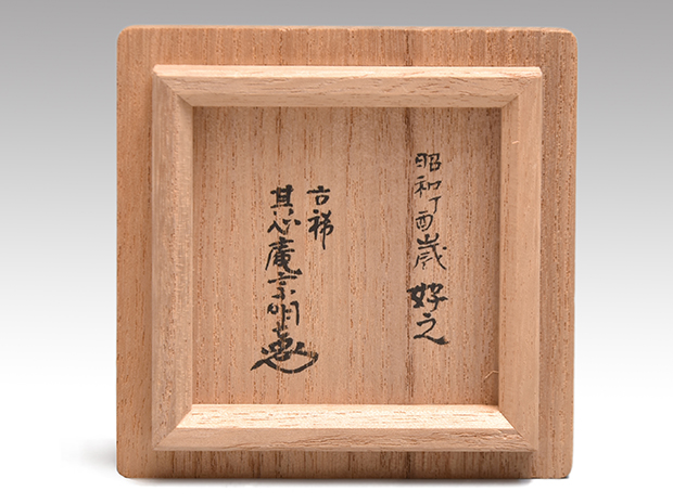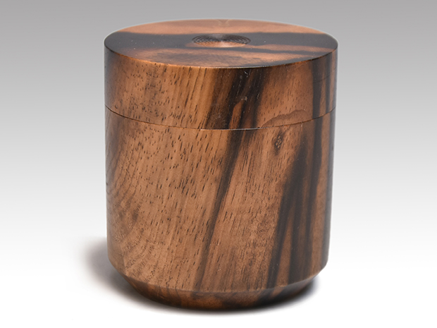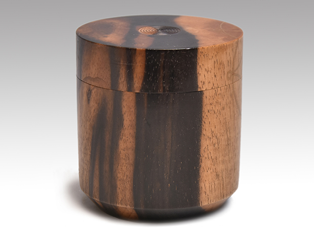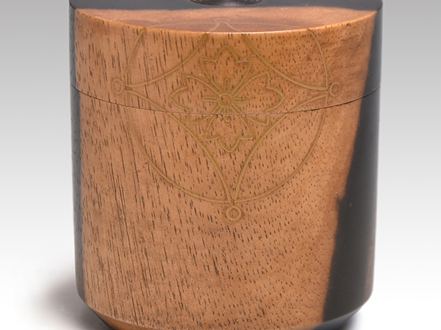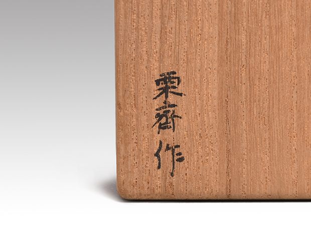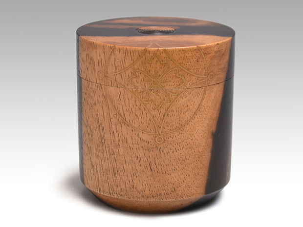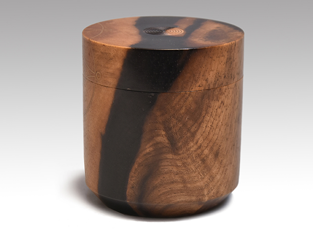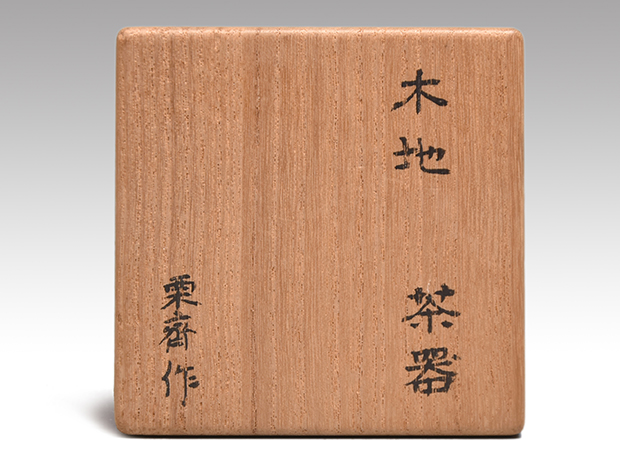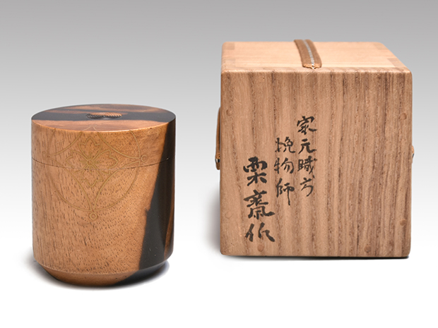 小堀宗明宗匠昭和32年の古稀に好んだ素晴らしい縞柿の木地茶器で正面に七宝文の金蒔絵が描かれております。 底に「栗」と作者名が入っております。 未使用と思われキズ欠点なく良い状態です。