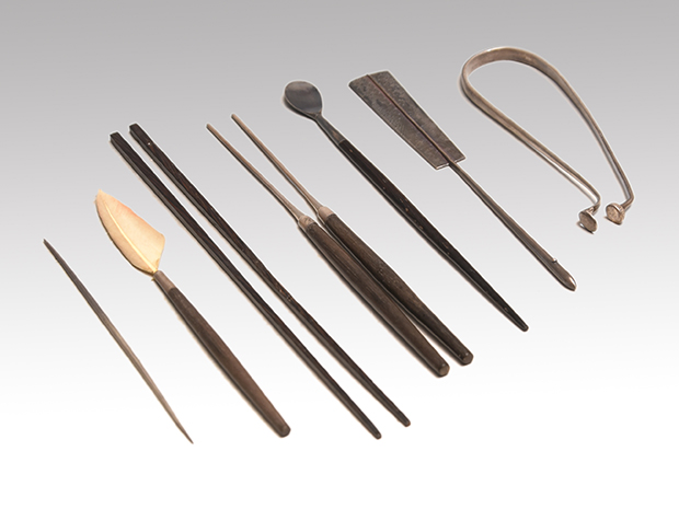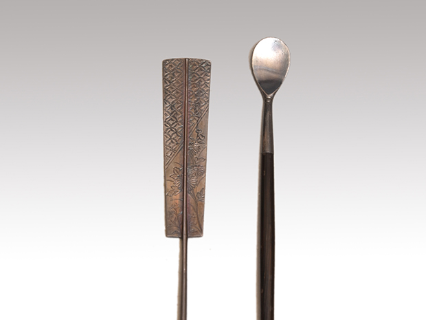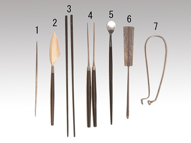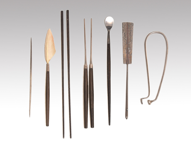 | 寸法 | 画面①:全長:10cm 重量:2.1g ②:全長:12.3cm 重量:1.1g ③:全長:16cm 重量:1.6g ④:全長:13.8cm 重量:5.4g(二本で) ⑤:全長:13.5cm 重量:2.8g ⑥:全長:12.2cm 最大幅:1.5cm 重量:10.2g ⑦:全長:9.2cm 幅:2.8cm 重量:8.5g 香筋建:口幅:縦3.5cm 横3.8cm 高さ:6.7cm 重量:34.5g |