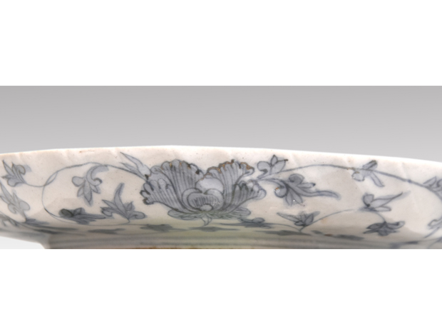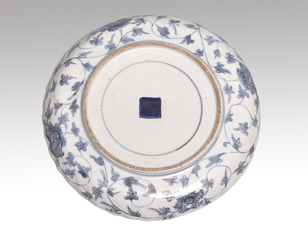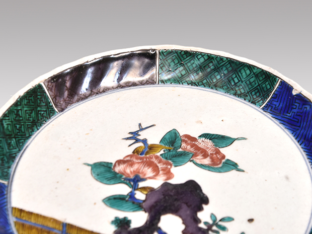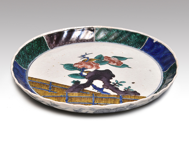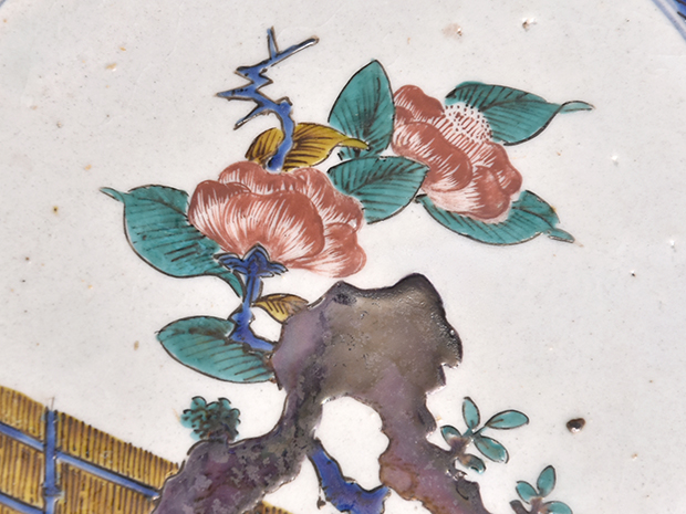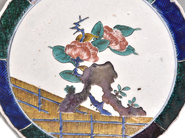 | 商品説明 | 見込みに岩間より伸びる椿を描いた、青手古九谷の中皿です。 緑・黄・紫・藍を基調とした青手ならではの力強い色彩に、 金彩を交えた垣文が器面を引き締め、古九谷特有の絵画的表現がよく表れています。 椿の葉の大胆な配色や岩肌の量感表現からは、古九谷様式の伸びやかな筆致が感じられます。 同手の作品は戸栗美術館にも所蔵されており、作域・様式ともに評価の高い逸品です。 焼成時による磁貫、色挿しが一ヵ所ございますが、鑑賞には影響ございません。 |