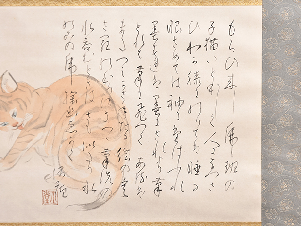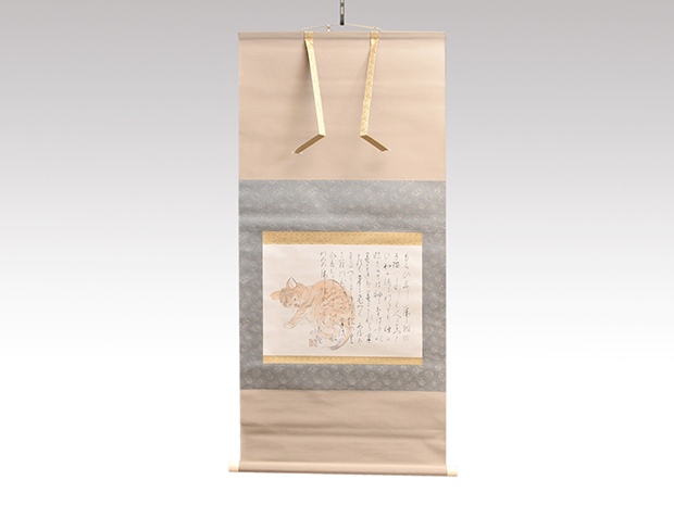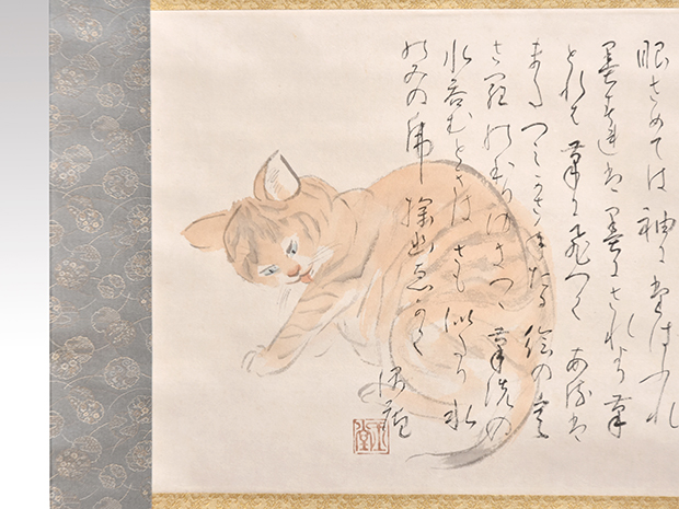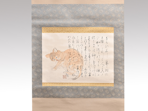 かわいい虎斑の子猫を描き賛を認めております。 書は 「もらひ来し虎斑の子猫いとほしく人になつきひわが膝に乗りては眠る目覚めては袖にたわむれ 墨すれば墨にざれより筆とれば筆に飛びつきあるはまたつみかさねたる絵の具さらのぼりゆきつつ筆洗の水の呑むときは さもにたり水のみの虎探幽えがく 偶庵 玉堂印」 戦後の最晩年作で軸装は良い状態です。