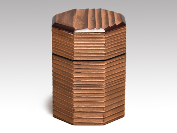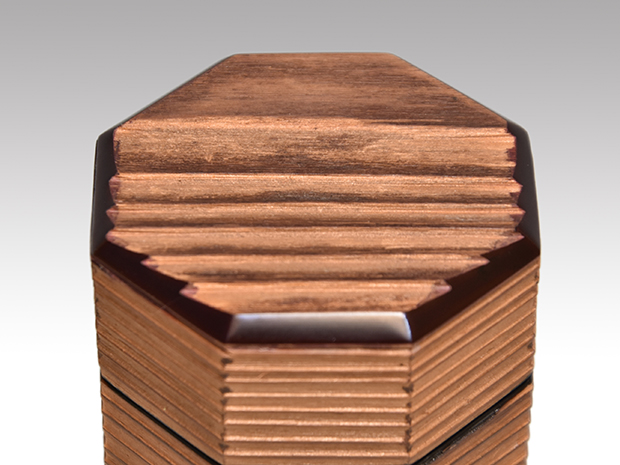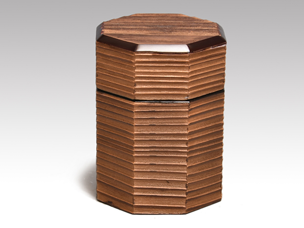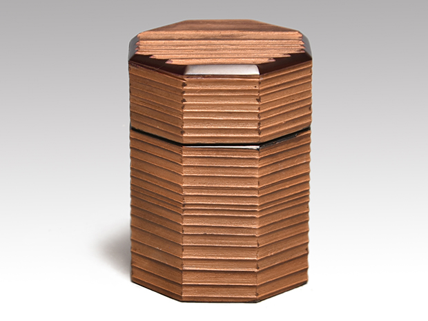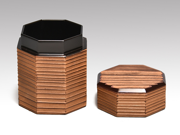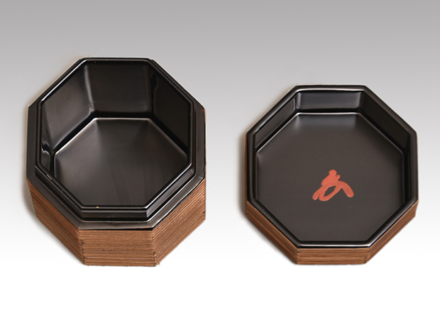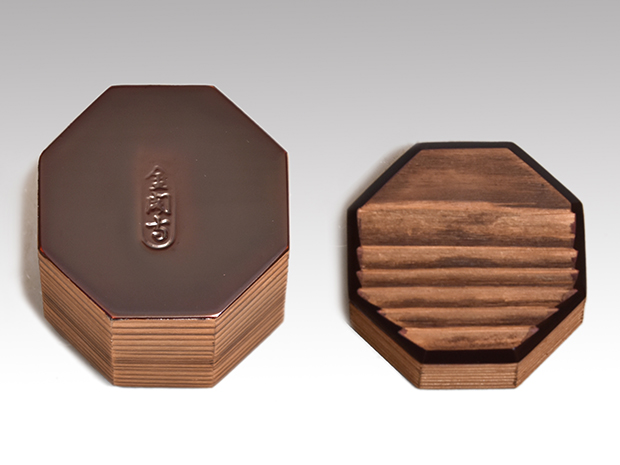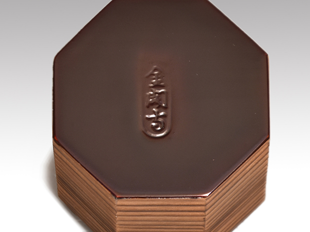 金閣寺夕佳亭古材を使用して製作した八角茶器です。 外側は古材で上面の縁と内側、底は真塗仕上げです。 蓋の内側に有馬頼底師の朱の花押が入り底に「金閣寺」の印が押されております。