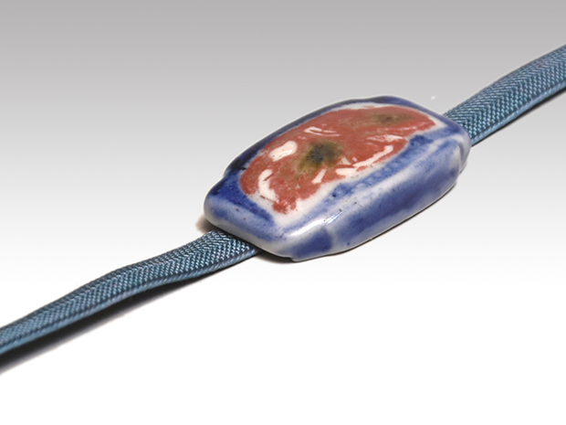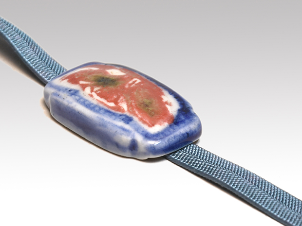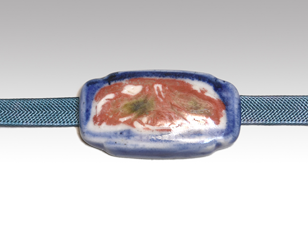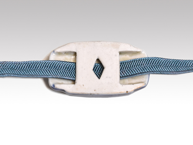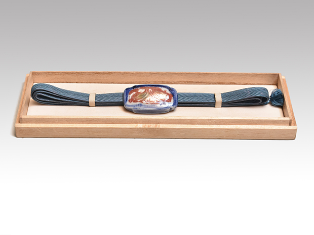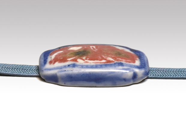 陶器帯止 染付に辰砂花文 箱に印有 未使用