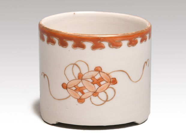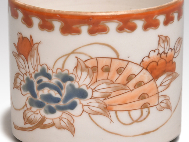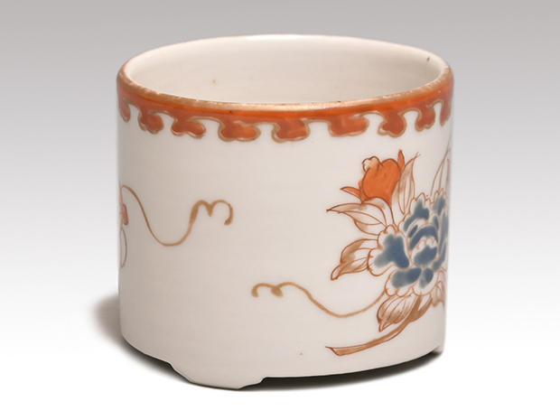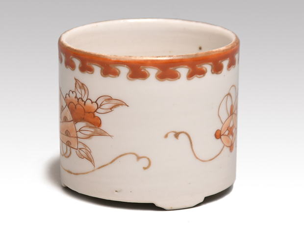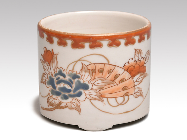 江戸時代に焼かれた伊万里焼の聞香炉です。 金、朱、青と多彩な色絵で花文に扇、七宝文様が胴に描かれております。 口にも朱で文様が一周巡らせております。 ヒビや欠けなどの傷みはなく、時代を考慮しても非常に良好な状態を保っております。