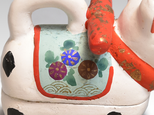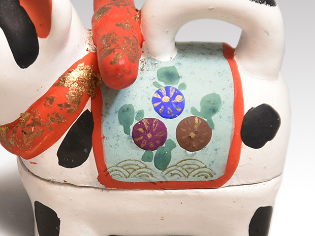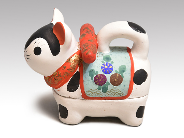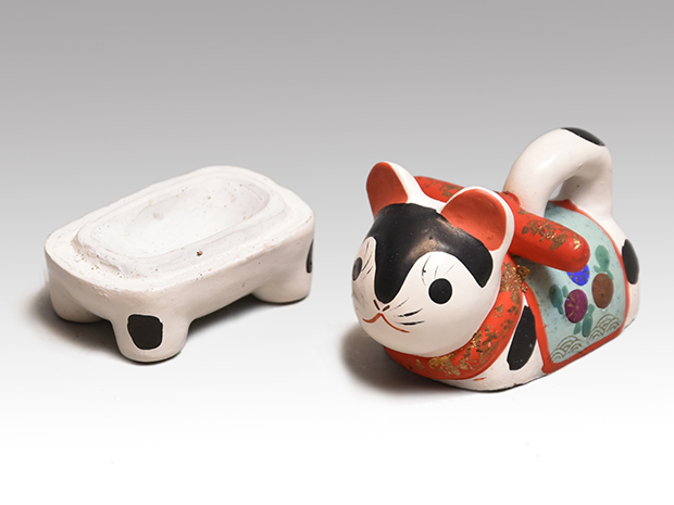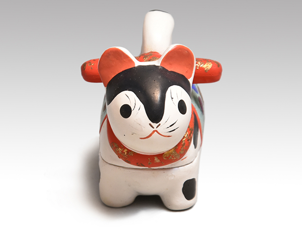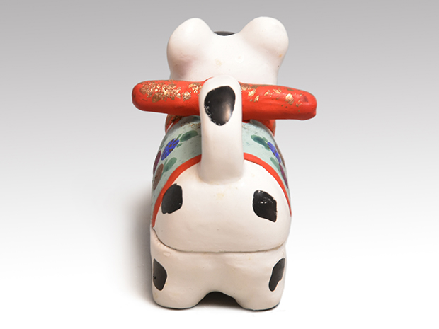 可愛い犬張子の香合です。 胡粉の上から極彩色で文様が施されております。 内側は箔散しの上から即中斎宗匠が墨で在判を書いております。 キズ欠点なく良い状態です。