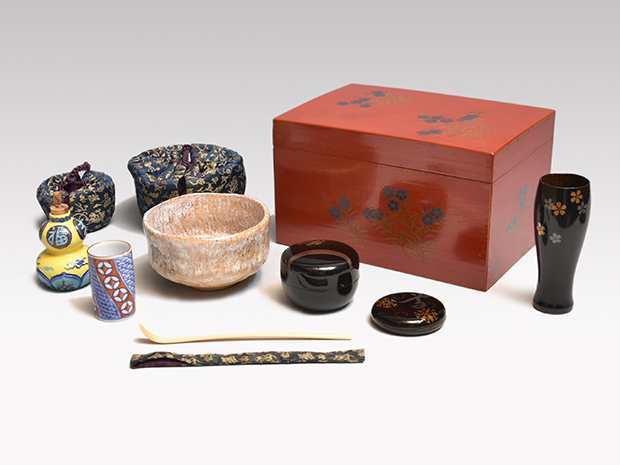 朱塗撫子蒔絵茶箱 四代 和気亀亭茶碗 雪月花3点蒔絵付 光甫(作) 象牙茶杓