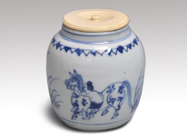 古染付 馬の絵茶入 象牙蓋 明末~清朝初期
