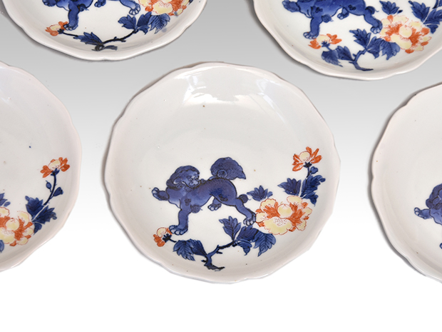 古伊万里(古九谷様式)色絵唐獅子牡丹文小皿5枚 時代箱 江戸時代中期頃