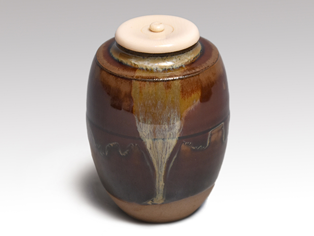 高取焼 肩衝茶入 高取喜恵(作) 共箱 象牙蓋 仕覆(龍文金襴)遠州七窯