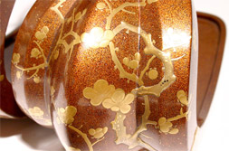 漆で模様を描いた箇所に粉を蒔きつけ、漆を塗り乾燥させた後、研磨して蒔絵層を出す。 |